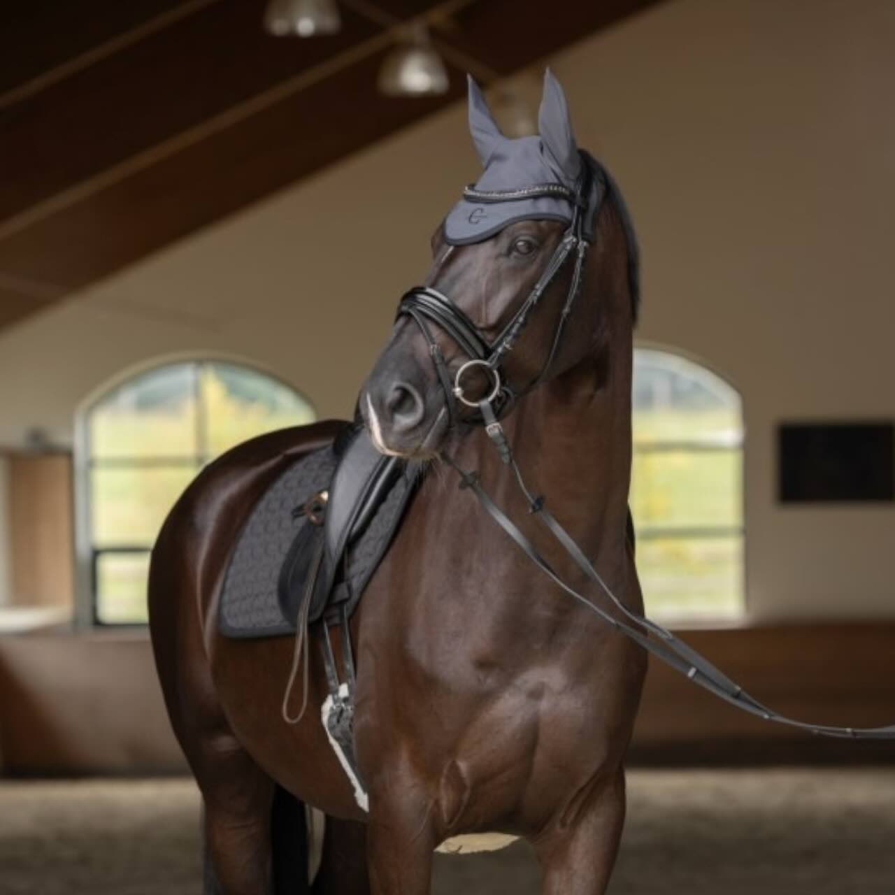 Die Covalliero Fliegenhaube Anniversary Kollektion 2025 Fliegenmütze überzeugt durch elastische Ohren, die sich angenehm an die Bewegungen deines Pferdes anpassen. So bleibt die Fliegenmütze auch bei intensiver Arbeit sicher an Ort und Stelle. Gleichzeitig bewahrt sie das Gehör deines Pferdes vor störenden Geräuschen und schützt effektiv vor lästigem Insektenbefall.