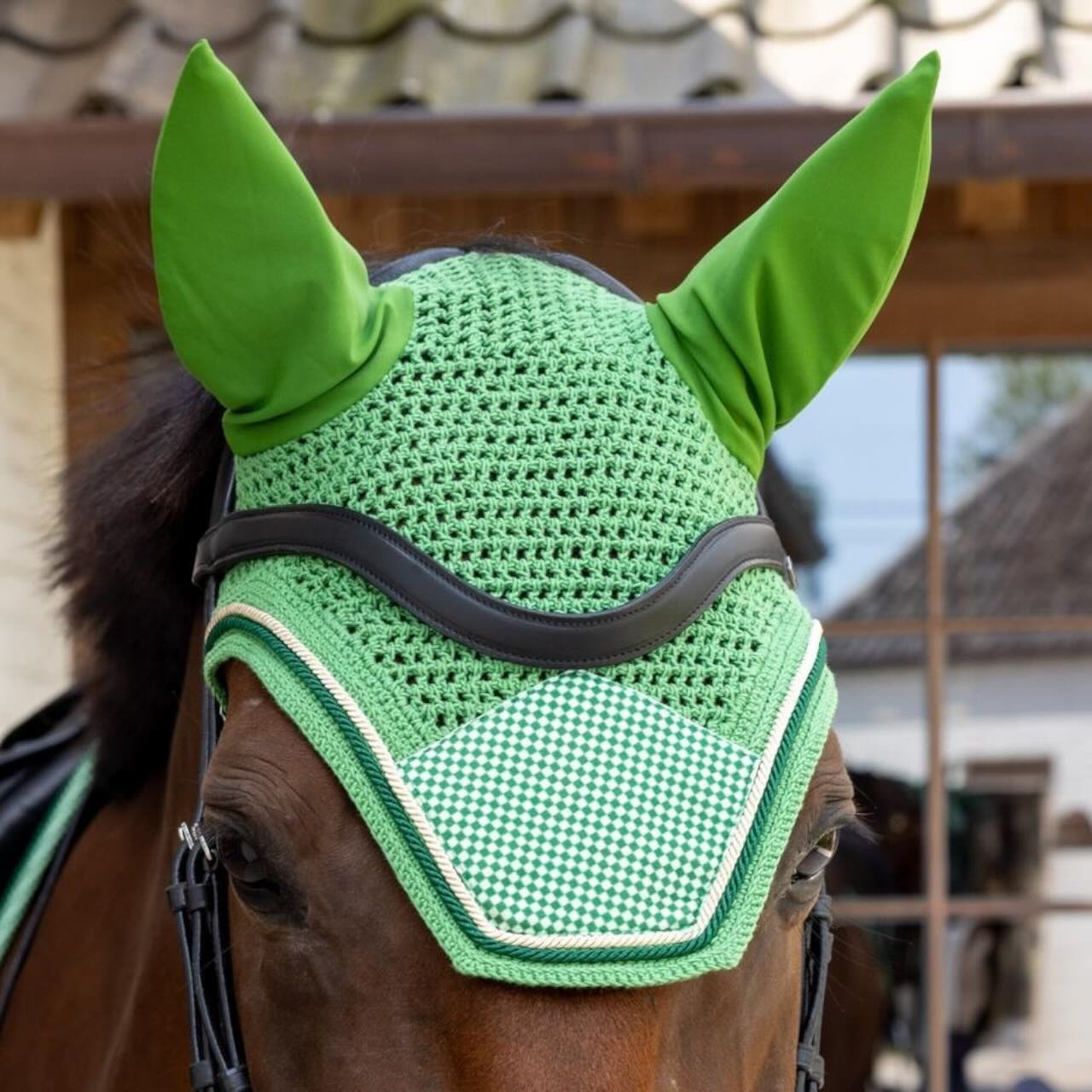 Damit sich dein Pferd jederzeit wohlfühlt, verfügt die Fliegenhaube über dehnbares Material an den Ohren. Dieses bietet einen angenehmen Sitz und vermeidet Druckstellen, auch bei längerem Einsatz. Ein verlängerter Nackenteil sorgt dafür, dass die Haube nicht verrutscht – selbst bei intensiven Trainingseinheiten oder Wettkämpfen. Durch die handgefertigte Verarbeitung bleibt die Form stabil und passt sich zugleich optimal an. Das atmungsaktive Material unterstützt den Komfort deines Pferdes bei allen Disziplinen, ob Dressur, Springen oder Eventing. Gleichzeitig wird ein harmonisches Gesamtbild geschaffen, das sowohl stilvoll als auch funktional überzeugt.