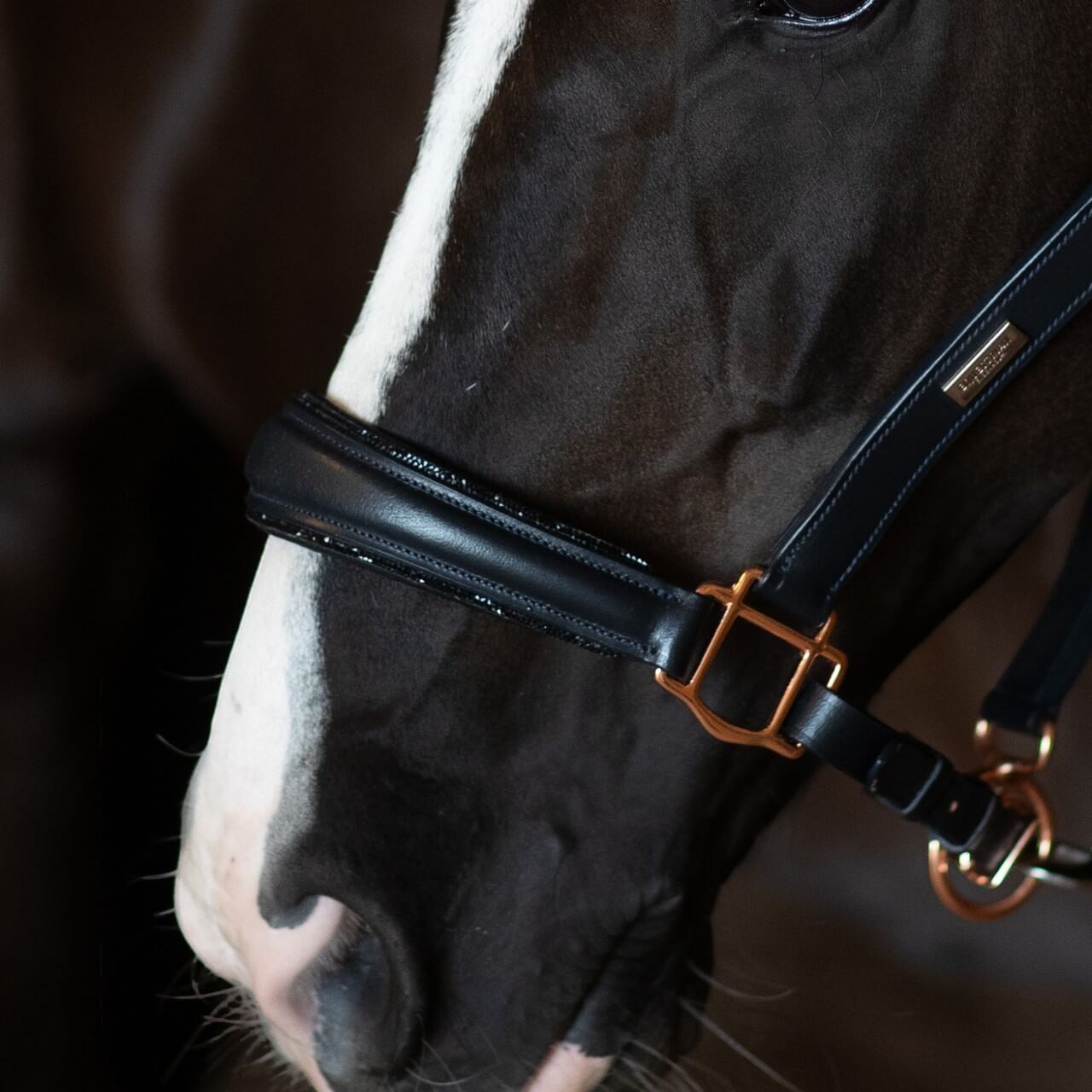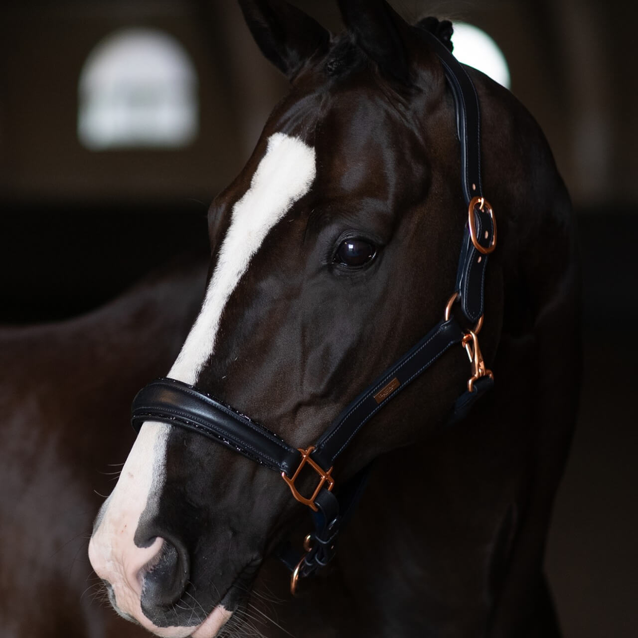 Das tiefblaue Leder des Lederhalfter Glimmer Leather Anatomic Halter Dark Ocean ist mit schwarzen Kristallen und roségoldenen Metallakzenten verziert, die einen stilvollen und exklusiven Look kreieren. Die filigranen Kristallverzierungen fügen sich harmonisch in das elegante Gesamtkonzept ein und lassen dein Pferd bei jedem Anlass glänzen.