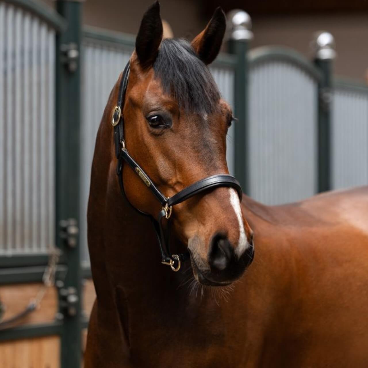 Dank der beidseitigen Dornschnallenverschlüsse lässt sich das Halfter optimal zentrieren – ein Vorteil bei Pferden mit asymmetrischem Kopfprofil. Zusätzlich ist es im Kinnbereich verstellbar, um eine passgenaue Anpassung zu ermöglichen. Ein weiteres durchdachtes Detail ist das abnehmbare Namensschild am Backenstück, das eine schnelle Identifikation erleichtert – besonders praktisch im Stallalltag. Die robusten Metallbeschläge sorgen für Stabilität und Langlebigkeit. Insgesamt überzeugt das Halfter durch eine Kombination aus Ästhetik, Komfort und Funktionalität.