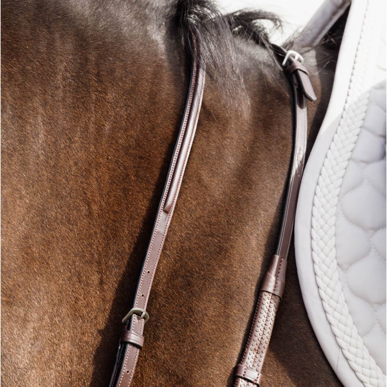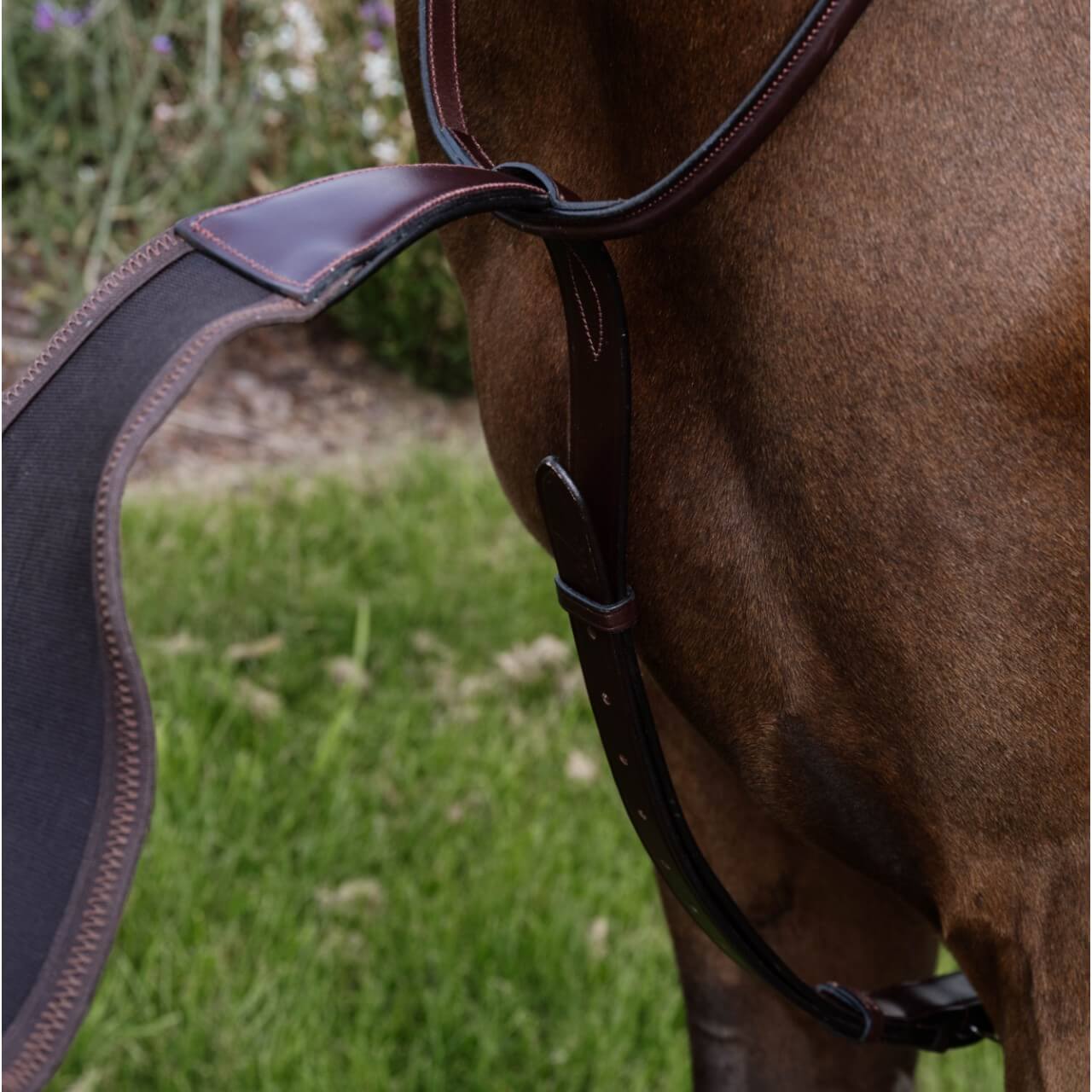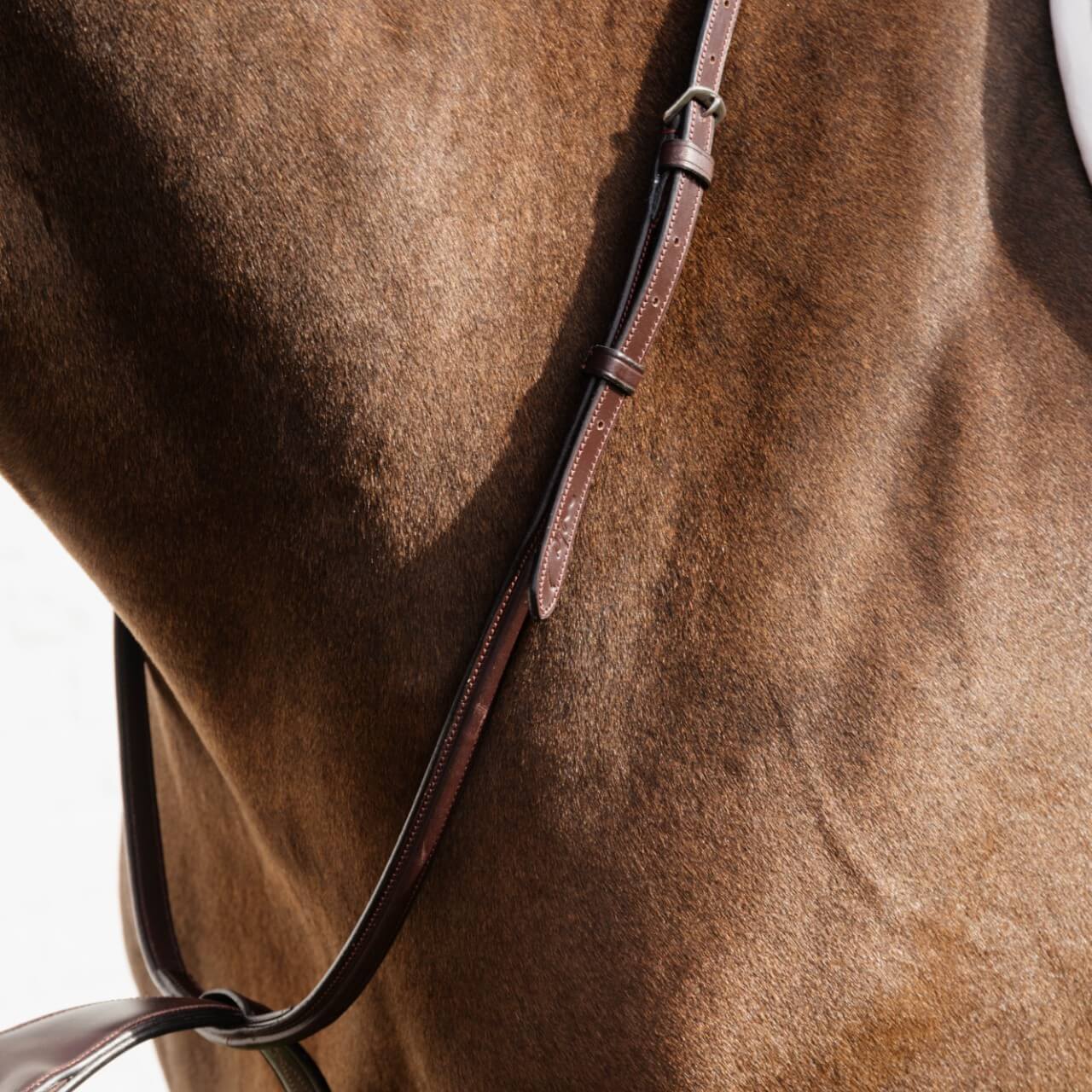 Gefertigt aus feinstem, pflanzlich gegerbtem europäischen Rindsleder. Die rostfreien Edelstahlschnallen und die farblich abgestimmten Nähte der New English-Kollektion verleihen diesem Sattelzubehör eine edle Optik. Erhältlich in klassischem Braun oder Schwarz.
