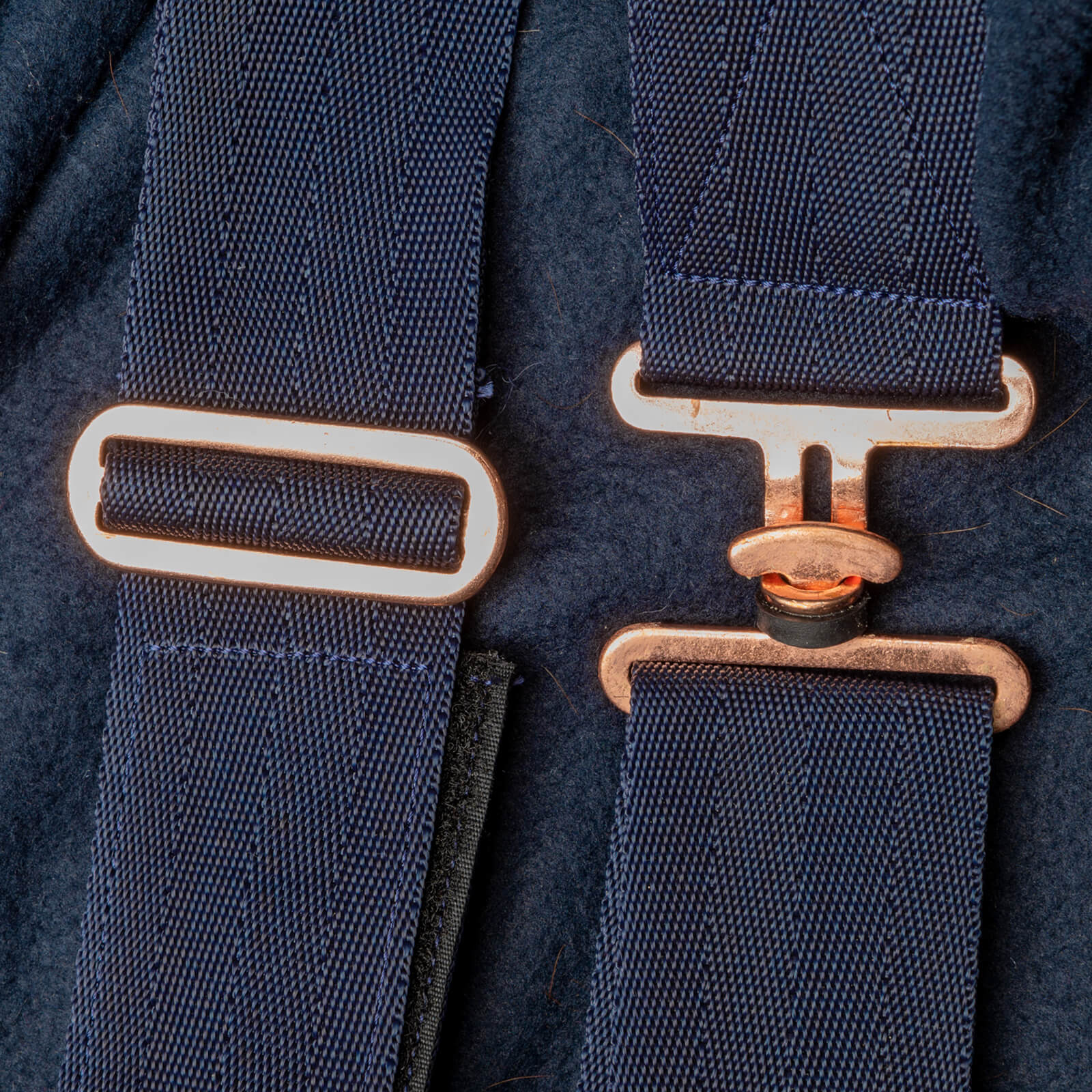 Der hochwertige Antipilling Fleece sorgt für eine hervorragende Abschwitzfunktion, indem er Feuchtigkeit schnell nach außen transportiert. Die abnehmbare Kreuzbegurtung gewährleistet, dass die Decke auch bei Bewegung nicht verrutscht. Der praktische Brustverschluss verstärkt die Stabilität und sorgt dafür, dass die Decke an ihrem Platz bleibt – ideal für den Stall- oder Turniereinsatz.