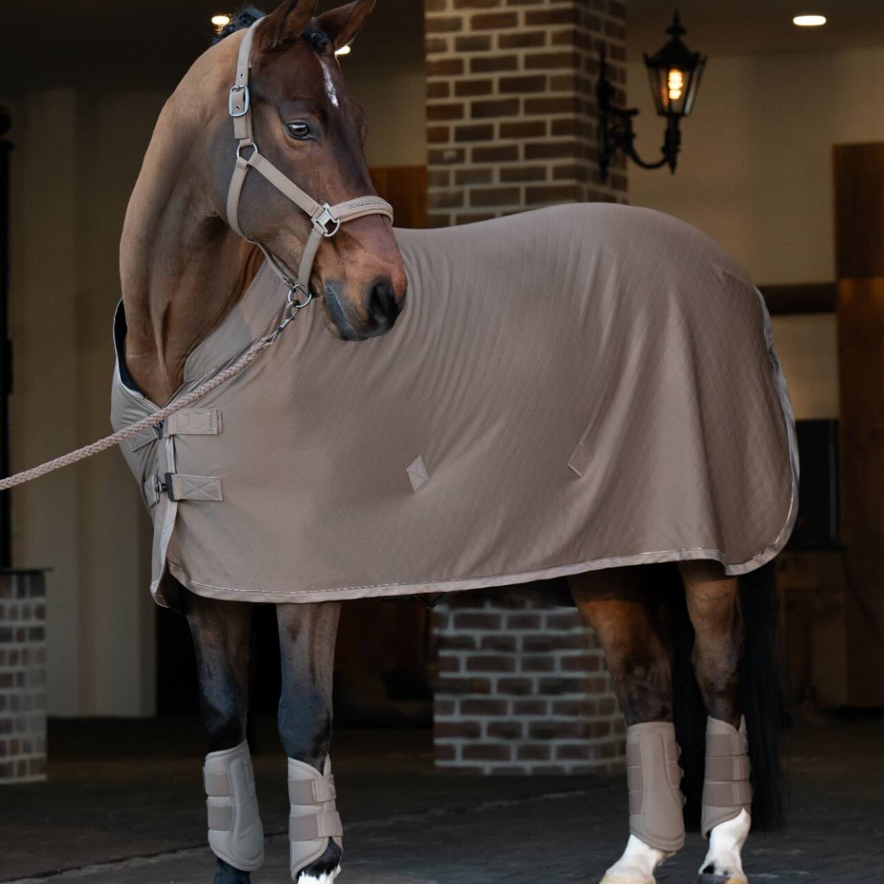 Die Abschwitzdecke Aerial Jersey Platinum 2025 besteht aus einem angenehm leichten und elastischen Material. Durch die dreidimensionale Prägung wird die Luftzirkulation gezielt gefördert. Dadurch schwitzt dein Pferd schneller und bleibt gleichzeitig vor Auskühlung geschützt. Das dehnbare Gewebe passt sich optimal der Körperform an und bietet hohen Tragekomfort. Der integrierte Schweifriemen hält die Decke sicher in Position. Damit ist sie ideal für Stall, Turnier oder Transport.