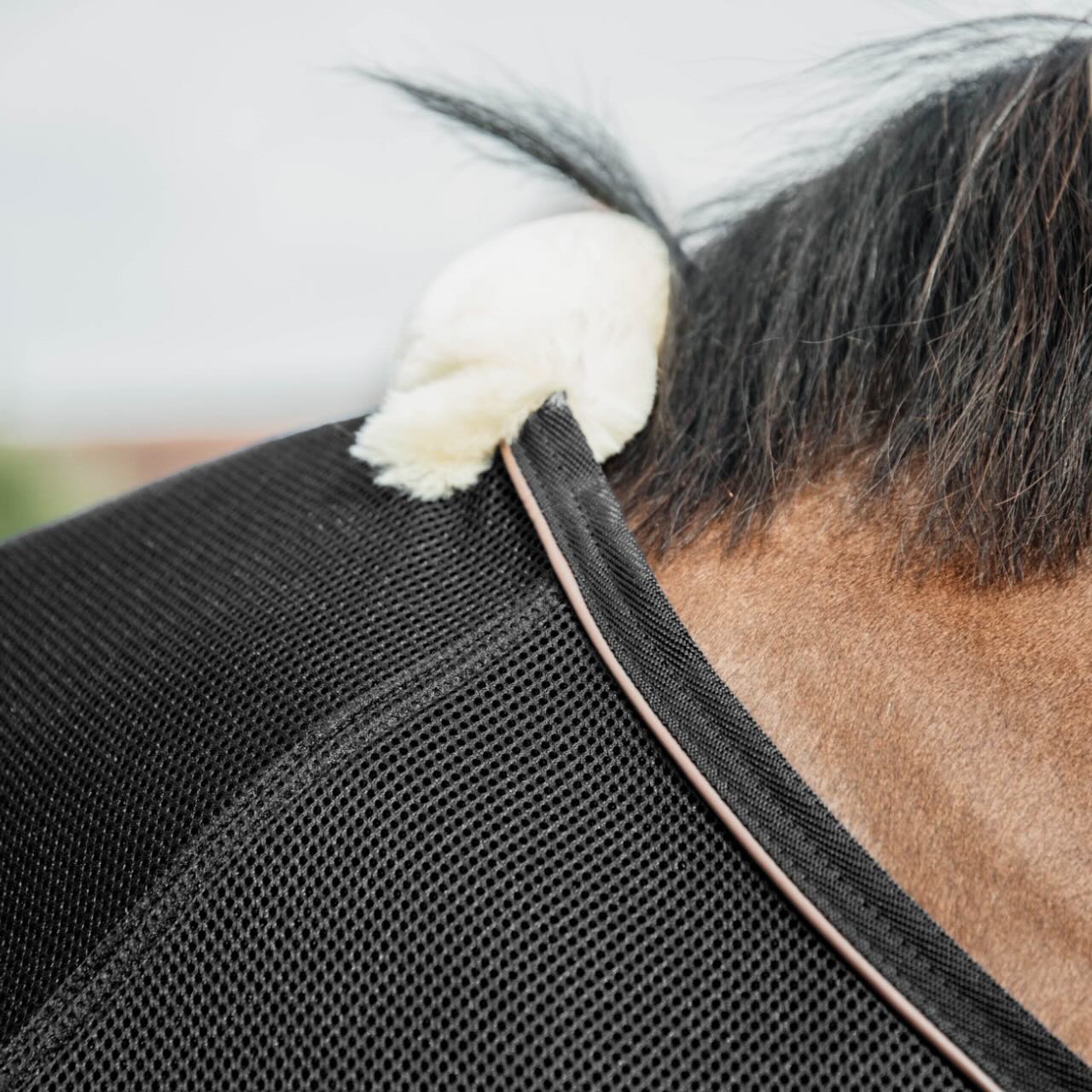 Bei der Kentucky Fliegen-Kombi Abschwitzdecke kommen mehrere Materialien zum Einsatz, die clever kombiniert sind. Das 3D-Spacer-Material im Inneren ist leicht, robust und nimmt Feuchtigkeit effektiv auf. Der untere Teil besteht aus Mesh, das dein Pferd zuverlässig vor Insekten schützt und gleichzeitig die Luftzirkulation verbessert. Haare haften nicht an der Oberfläche, was die Decke besonders pflegeleicht macht. Die flach gefütterte Schulterpartie sorgt für eine anatomische Passform und hohen Tragekomfort. Veganes Schaffell am Widerrist beugt Scheuerstellen vor und erhöht das Wohlbefinden deines Pferdes. Mit dieser Materialauswahl wird die Decke zum funktionalen Begleiter in jeder Situation.
