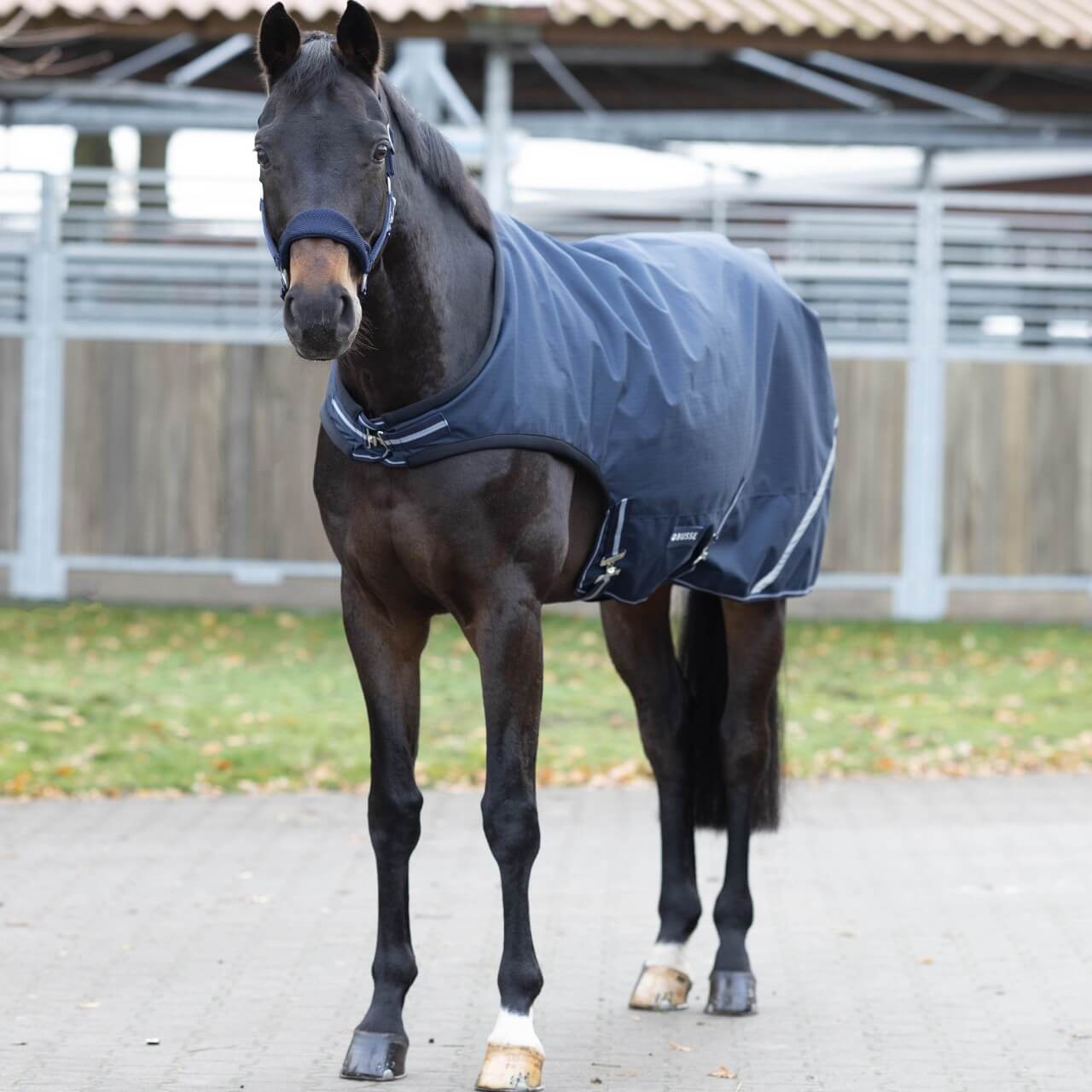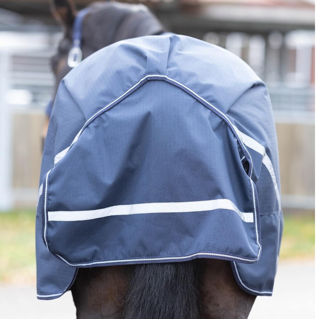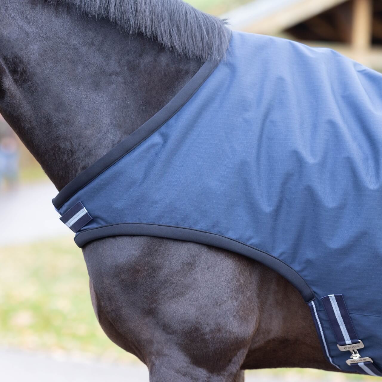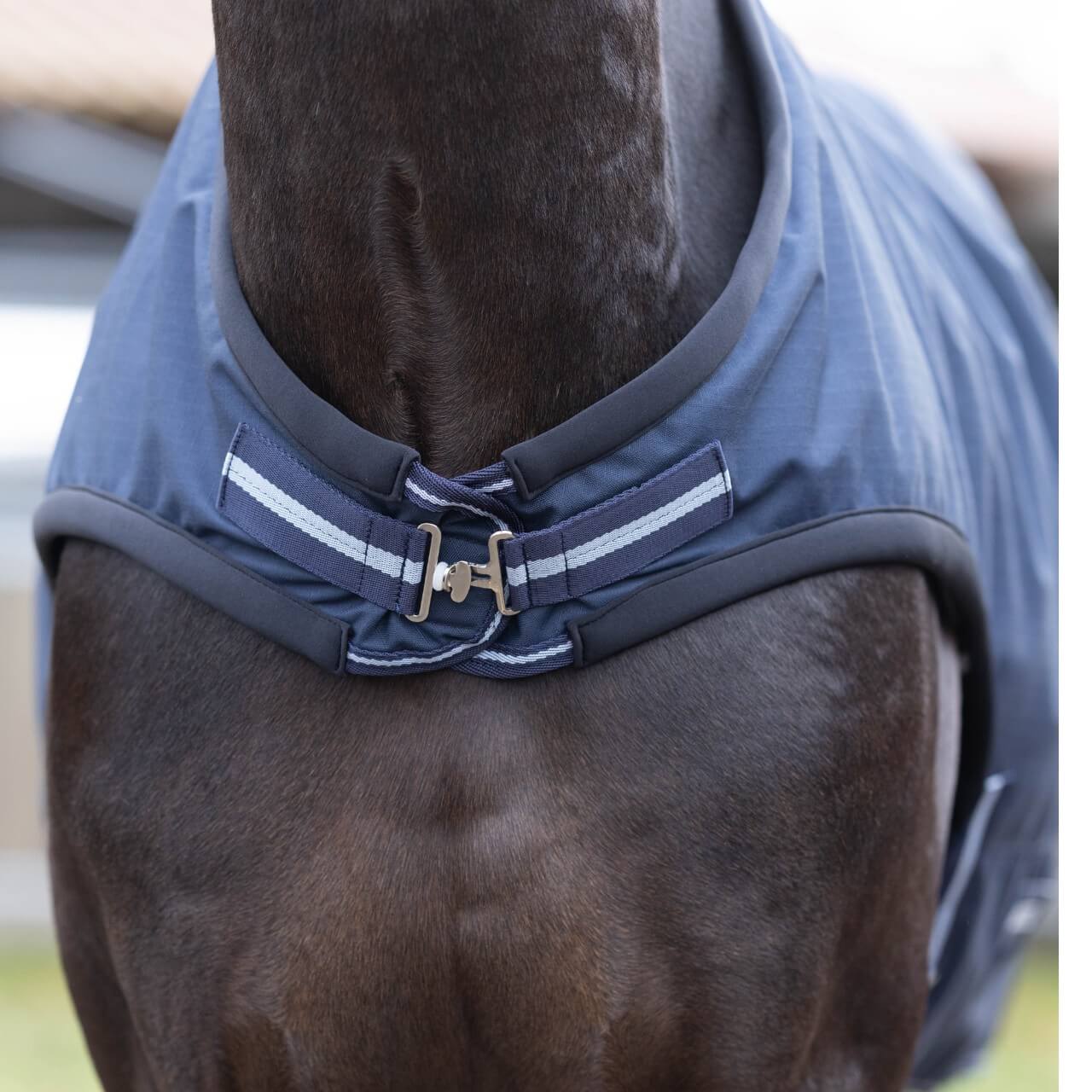 Die Decke verfügt über eine leichte Wärmeisolierung, damit das Pferd während der Nutzung seine Wohlfühltemperatur halten kann. Darüber hinaus ist sie mit einem extrem gleitfähigen Satinfutter ausgestattet, das für eine fellschonende Bewegung sorgt, ohne zu reiben. Der Schulter-, Brust- und Halsbereich sind, zur Vermeidung von Scheuerstellen, komplett mit weichem und anschmiegsamem, synthetischem Kautschuk mit hautfreundlicher Jersey-Oberfläche eingefasst. Reflektorstreifen auf beiden Längsseiten sowie der Schweifabdeckung sorgen für bessere Sichtbarkeit bei Dunkelheit.