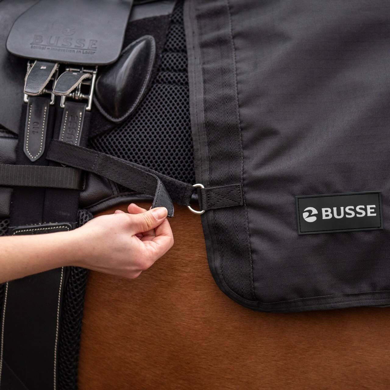 Die Trainingsdecke lässt sich einfach abnehmen, ohne dass du absitzen oder den Sattel lösen musst. Das macht den Umgang besonders komfortabel und spart wertvolle Zeit. Durch teilbare Klettverschlüsse kannst du die Decke unkompliziert mit anderen Busse Trainingsdecken kombinieren. Auch bei plötzlichen Wetterumschwüngen bleibst du so flexibel. Praktische Reflektorstreifen erhöhen zudem die Sicherheit bei Ausritten in der Dämmerung. Jede Funktion ist darauf ausgelegt, dir und deinem Pferd ein reibungsloses Trainingserlebnis zu ermöglichen.