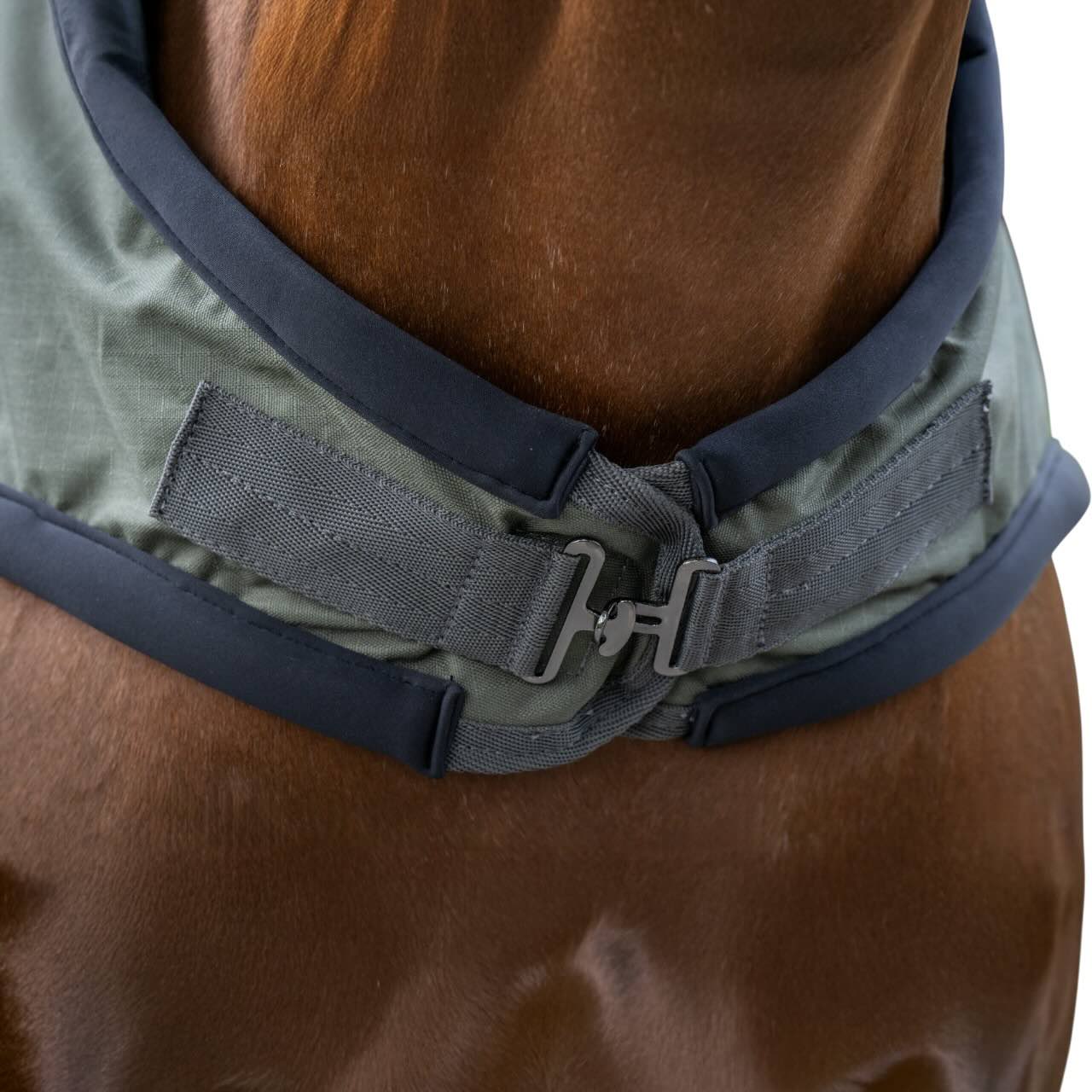Besonders praktisch ist die Kompatibilität mit zusätzlichen Halsteilen und Linern, die sich dank des integrierten Klettsystems einfach befestigen lassen. Dadurch kannst du die Decke individuell an die Bedürfnisse deines Pferdes und die jeweilige Wetterlage anpassen. Das macht sie zu einem echten Allrounder für die gesamte Deckensaison. Mit T-Verschluss und Klett vorne ist ein schnelles An- und Ausziehen möglich. Eine längeneinstellbare Kreuzbegurtung sowie die tiefe Hinterhandkordel sorgen für sicheren Halt. Damit genießt dein Pferd uneingeschränkten Komfort bei jeder Bewegung.