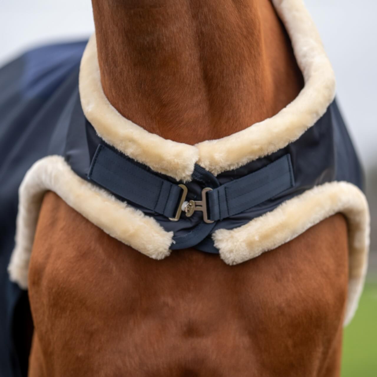 Für zusätzlichen Komfort ist der Kragenbereich mit edlem Satin und modernem Logoprint gestaltet. Schulter, Brust und Hals sind mit weichem Kunstfell eingefasst, um Scheuerstellen zuverlässig zu vermeiden. Der T-Verschluss mit Klett vorne sorgt für eine einfache Handhabung. Eine längeneinstellbare Kreuzbegurtung sowie ein elastischer Hinterhandgurt gewährleisten sicheren Halt in Bewegung. Das fellfreundliche Satinlining unterstützt freie Bewegungen und schont das Fell. So vereint die Decke Funktionalität, Komfort und Design auf hohem Niveau.