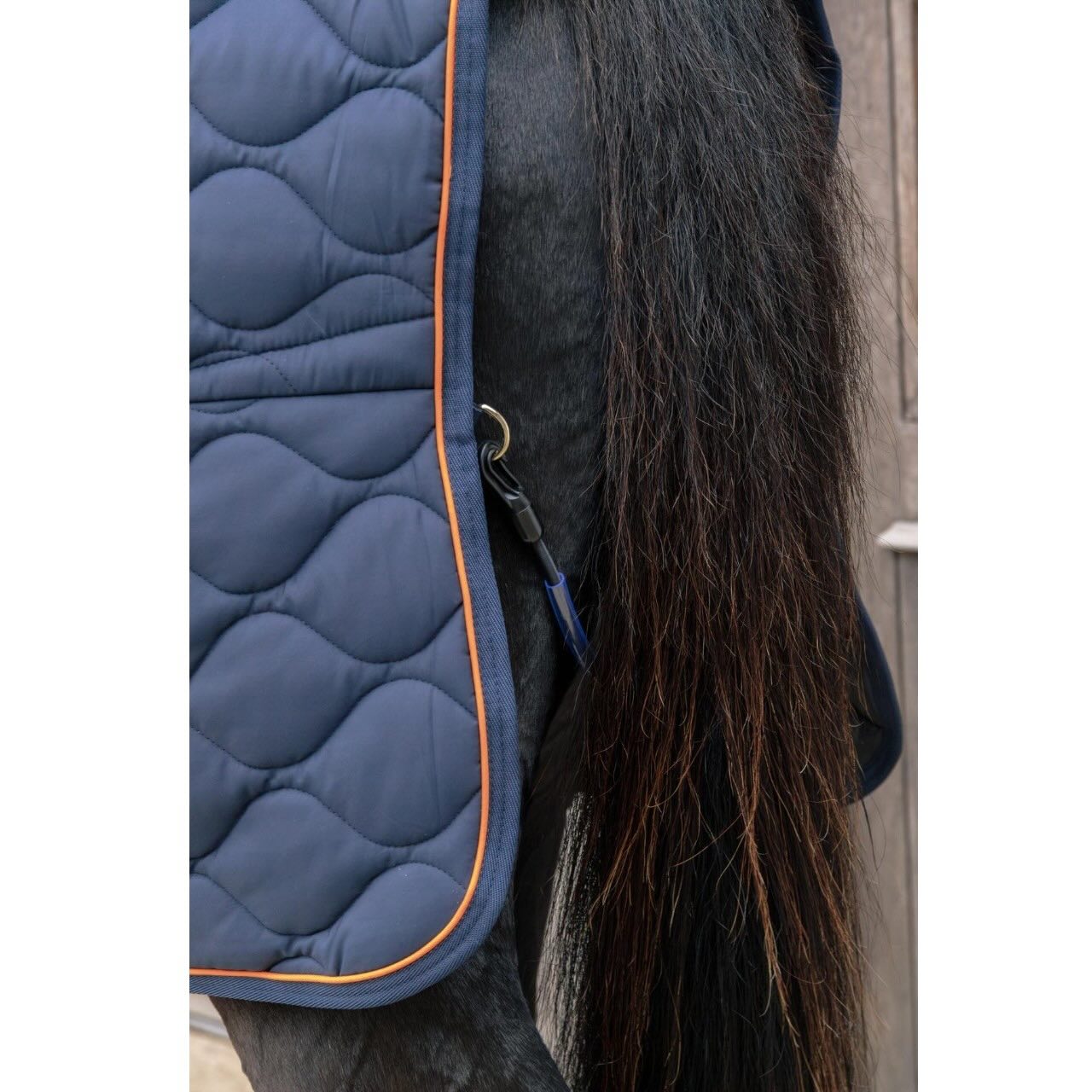 Mit ihrem trendigen Wellensteppmuster setzt diese Decke optisch neue Maßstäbe. Das Außenmaterial aus 600D-Polyester ist besonders strapazierfähig und bietet Schutz vor Abnutzung. Gleichzeitig ist die Decke extrem leicht und lässt sich mühelos handhaben. Die 160g-Füllung sorgt für ein ausgewogenes Wärmeniveau, perfekt für kühlere Tage. Dank der glatten Innenseite wird das Fell deines Pferdes geschont, Scheuerstellen werden effektiv verhindert. Ein abnehmbares elastisches Band mit Plastikschutz ergänzt das durchdachte Design.