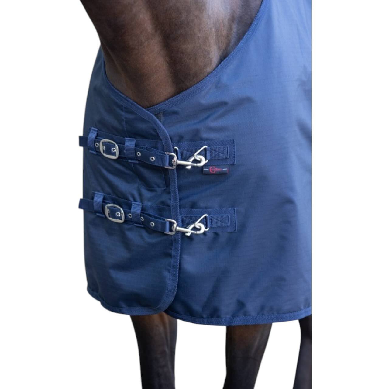 Mit einem hochwertigen 600 Denier Polyester ist die Decke besonders reißfest und langlebig. Die stark wasserabweisende Oberfläche hält Regen bis zu einer Wassersäule von 3000 mm zuverlässig ab. Zusätzlich sorgt eine Luftdurchlässigkeit von 3000 g/m²/24 h für ein ausgewogenes Klima unter der Decke. Durch Kreuzbegurtung am Bauch bleibt die Decke sicher in Position, auch bei lebhaften Bewegungen. Ein Schweiflatz, Beinschnüre sowie ein Widerristpolster aus Synthetikkautschuk bieten zusätzlichen Halt und Schutz. So bist du für jedes Wetter bestens vorbereitet.