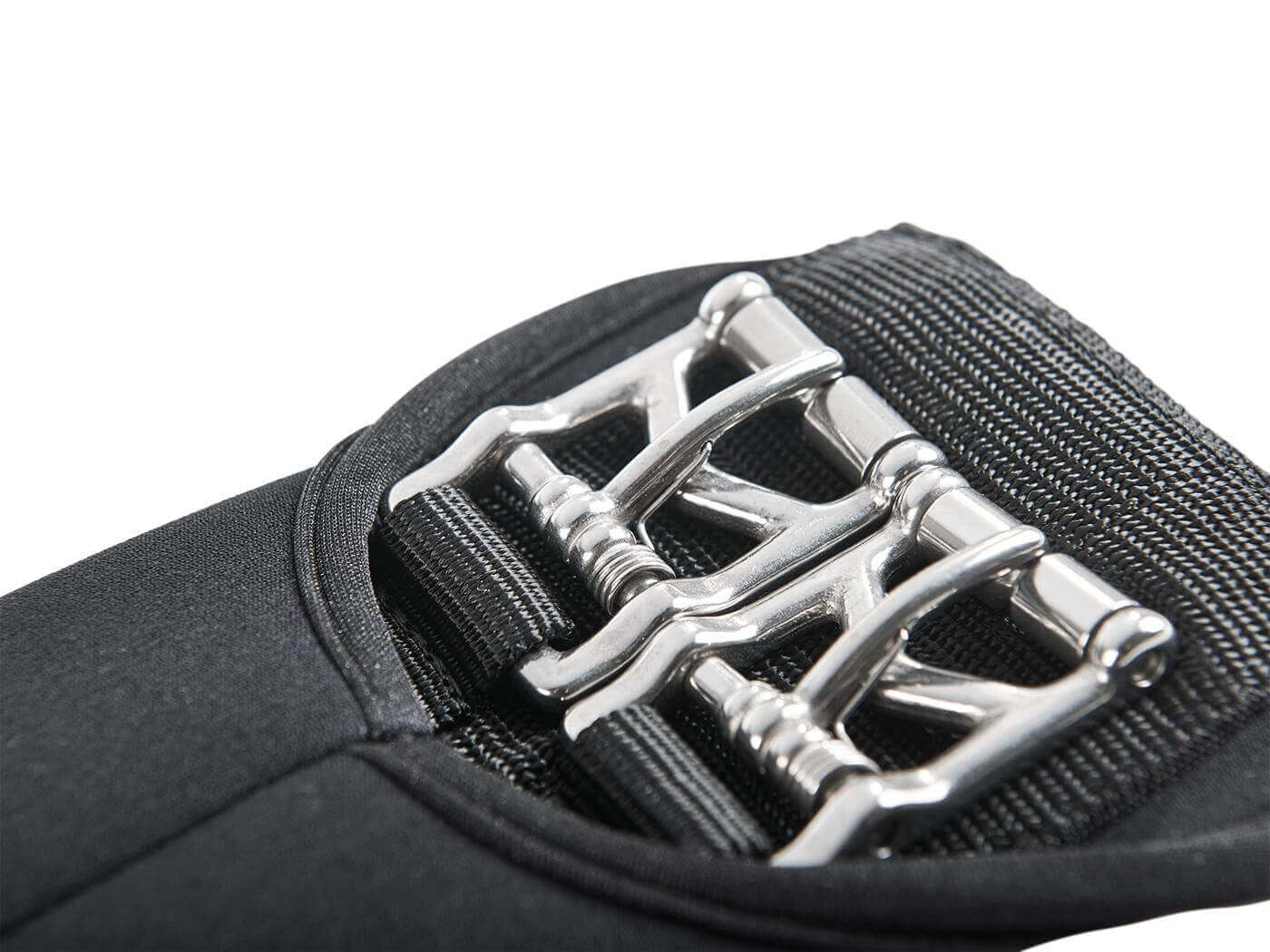 - Pro Schnallen: Patentierte Rollschnallen aus Edelstahl mit Feder, die den Dorn beim Nachgurten automatisch in das nächste Loch gleiten lässt für besonders einfaches, einhändiges Nachgurten, langlebige Rollen ohne Schweißnaht zur Schonung der Gurtstrupfen, besonders flach durch Einkerbung