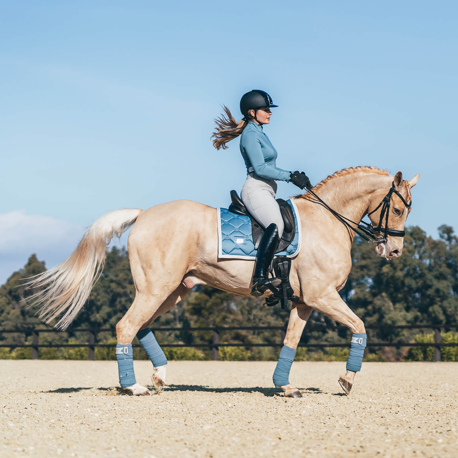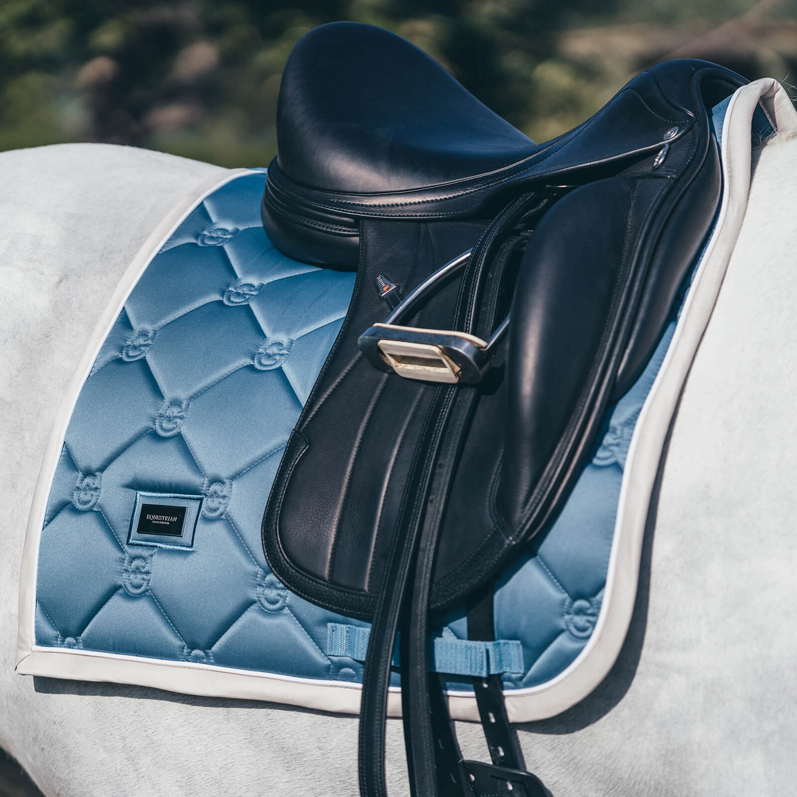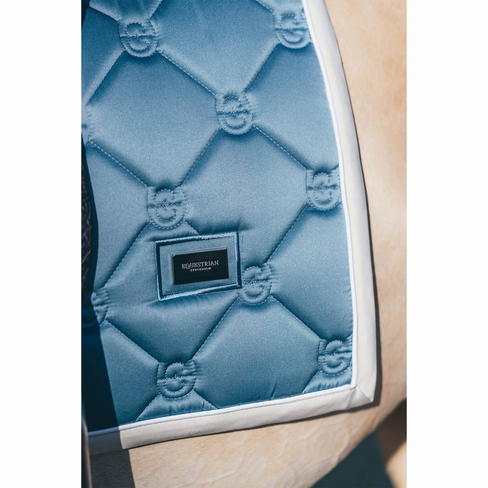 Dressurschabracke Stone Blue FS 2022 Schabracke von Equestrian Stockholm vereint elegantes Design mit innovativer Funktionalität. Diese hellblaue Schabracke aus der Frühjahr/Sommer Kollektion 2022 bringt nicht nur einen Hauch von Stil in dein Reitoutfit, sondern bietet auch atmungsaktive und schnelltrocknende Eigenschaften für maximale Leistung.