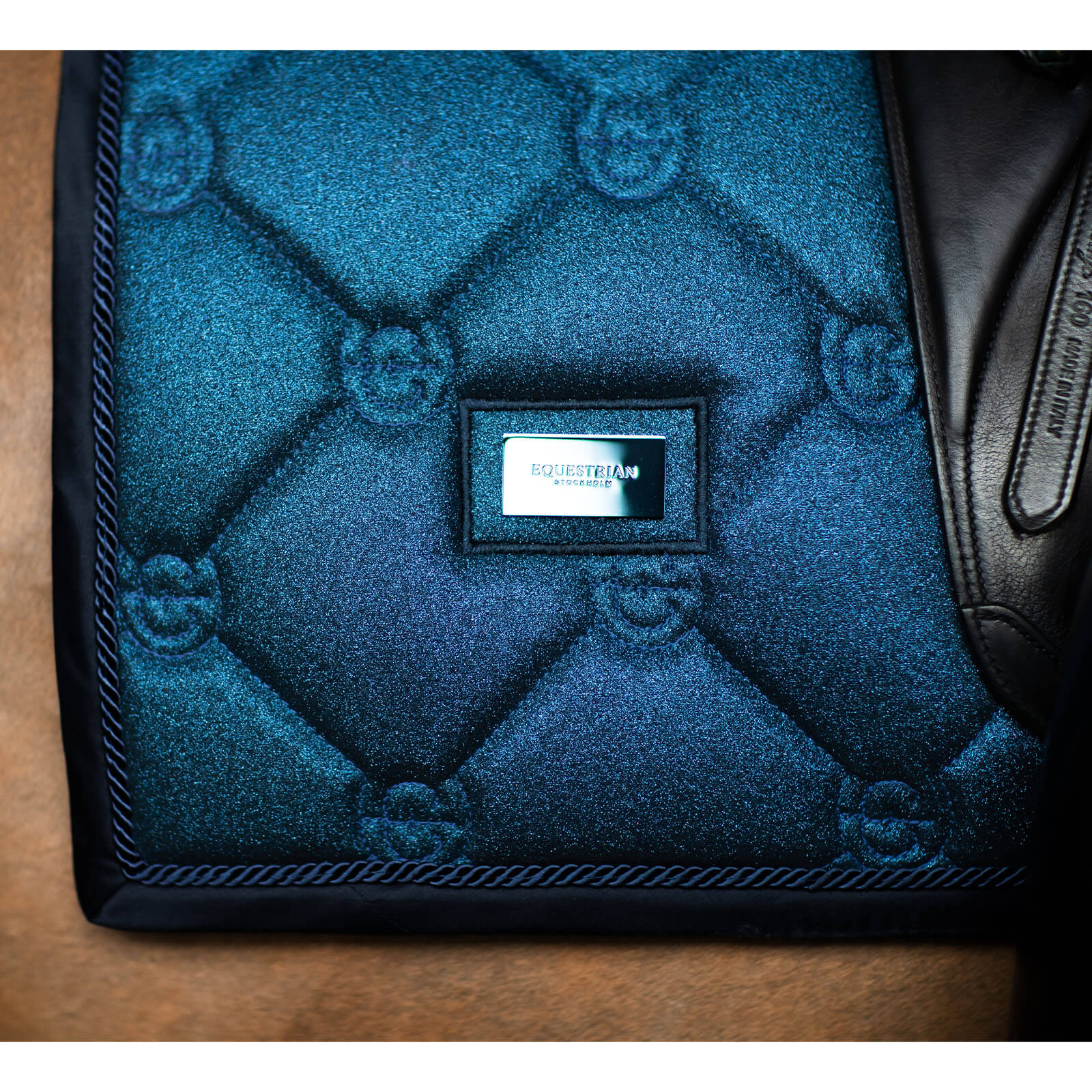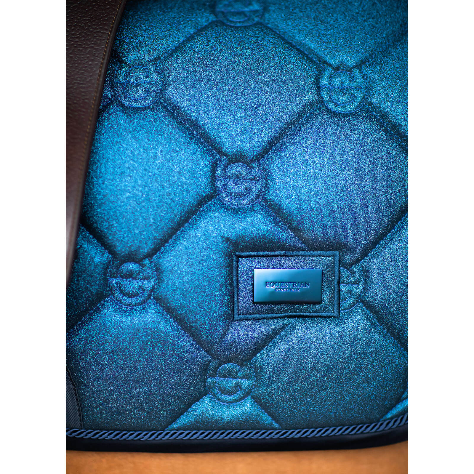 Schabracke Dressur Blue Meadow Glimmer FS 2023 Dressurschabracke von Equestrian Stockholm ist die perfekte Wahl für anspruchsvolle Reiter, die Eleganz und Leistung suchen. Mit ihrem faszinierenden blauen Glitzerdesign und hervorragenden technischen Eigenschaften vereint diese Schabracke Stilbewusstsein mit praktischen Vorteilen. Genieße die Kombination aus ästhetischem Reiz und funktionaler Exzellenz bei jedem Ritt.