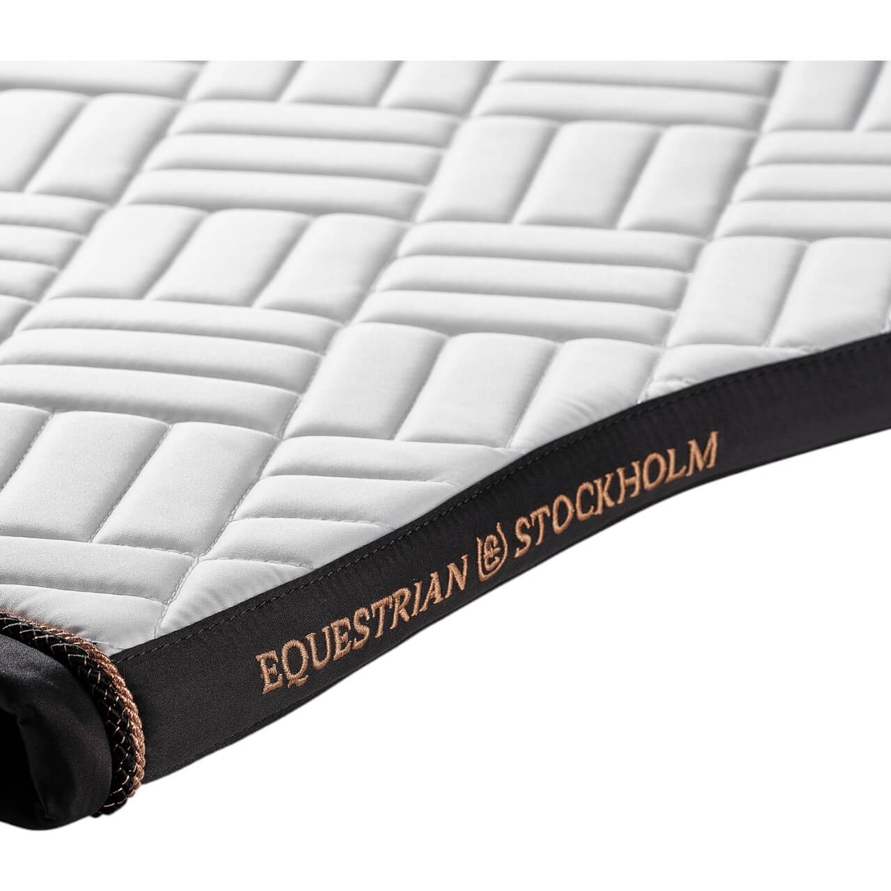 Dressurschabracke Dressage Saddle Pad White Modern Dark Ocean Schabracke Dressur von Equestrian Stockholm vereint moderne Eleganz mit nachhaltiger Funktionalität. Erlebe ein harmonisches Zusammenspiel aus Komfort, erstklassiger Verarbeitung und einem edlen Design, das dein Reiterlebnis auf ein neues Niveau hebt.