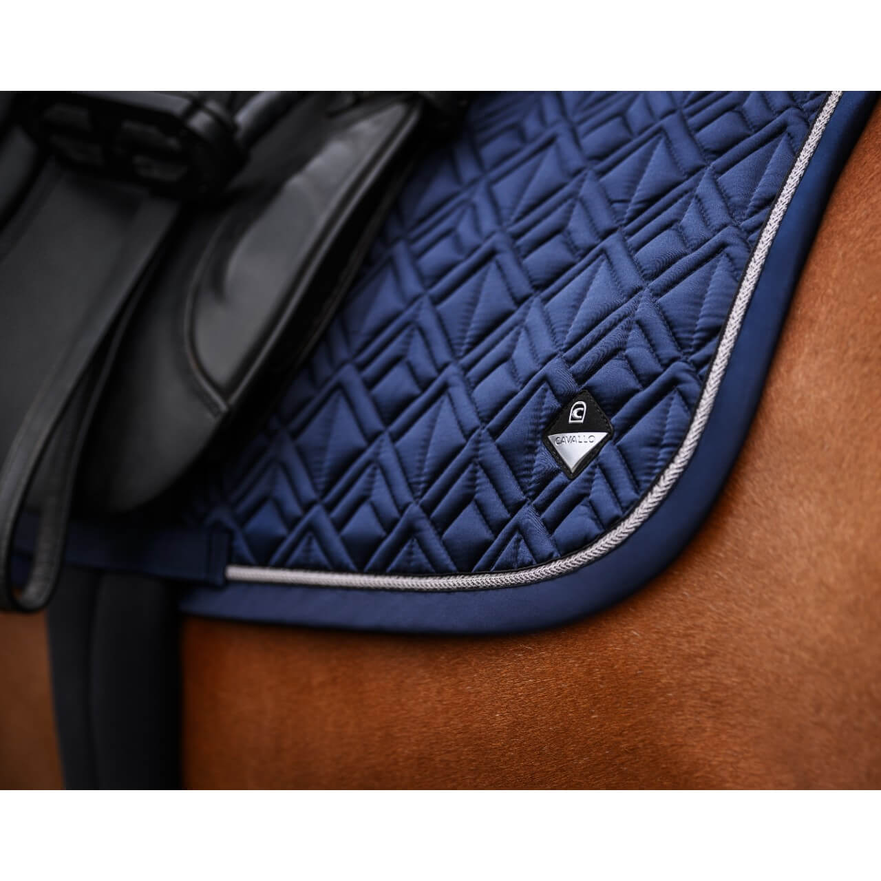 Das grafische Steppmuster der Cavaljorah FS 2025 betont das glänzende Satin-Obermaterial und verleiht der Schabracke eine luxuriöse Optik. Der aufwendige Tape-Rand und strategisch platzierte Cavallo-Logo-Patches machen sie zum Hingucker, egal ob im Training oder auf dem Turnier. Das Design ist nicht nur schön anzusehen, sondern sorgt auch für eine ideale Passform und Stabilität.