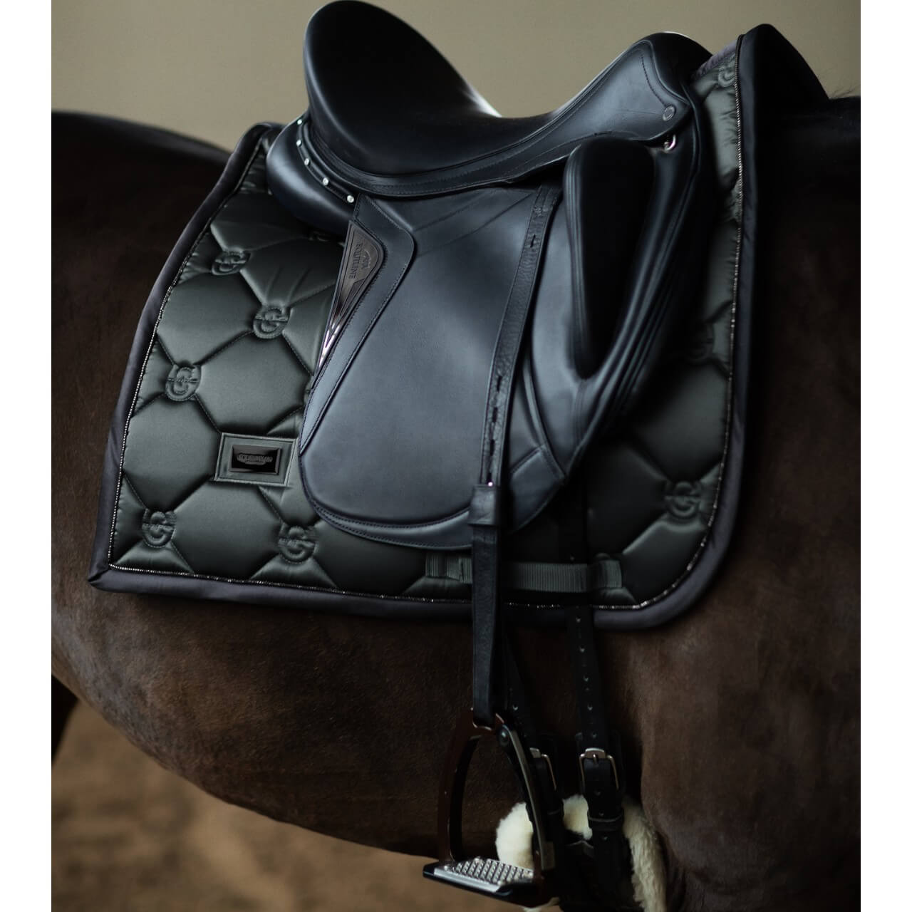 Das tiefgrüne Design der Schabracke wird durch silberne Paspeln und ein schwarzes Metall-Logo stilvoll ergänzt. Die dezente Steppung verleiht der Schabracke eine elegante Struktur und sorgt für eine optimale Passform unter dem Sattel. So wird sie zum perfekten Begleiter für Training und Turnier.