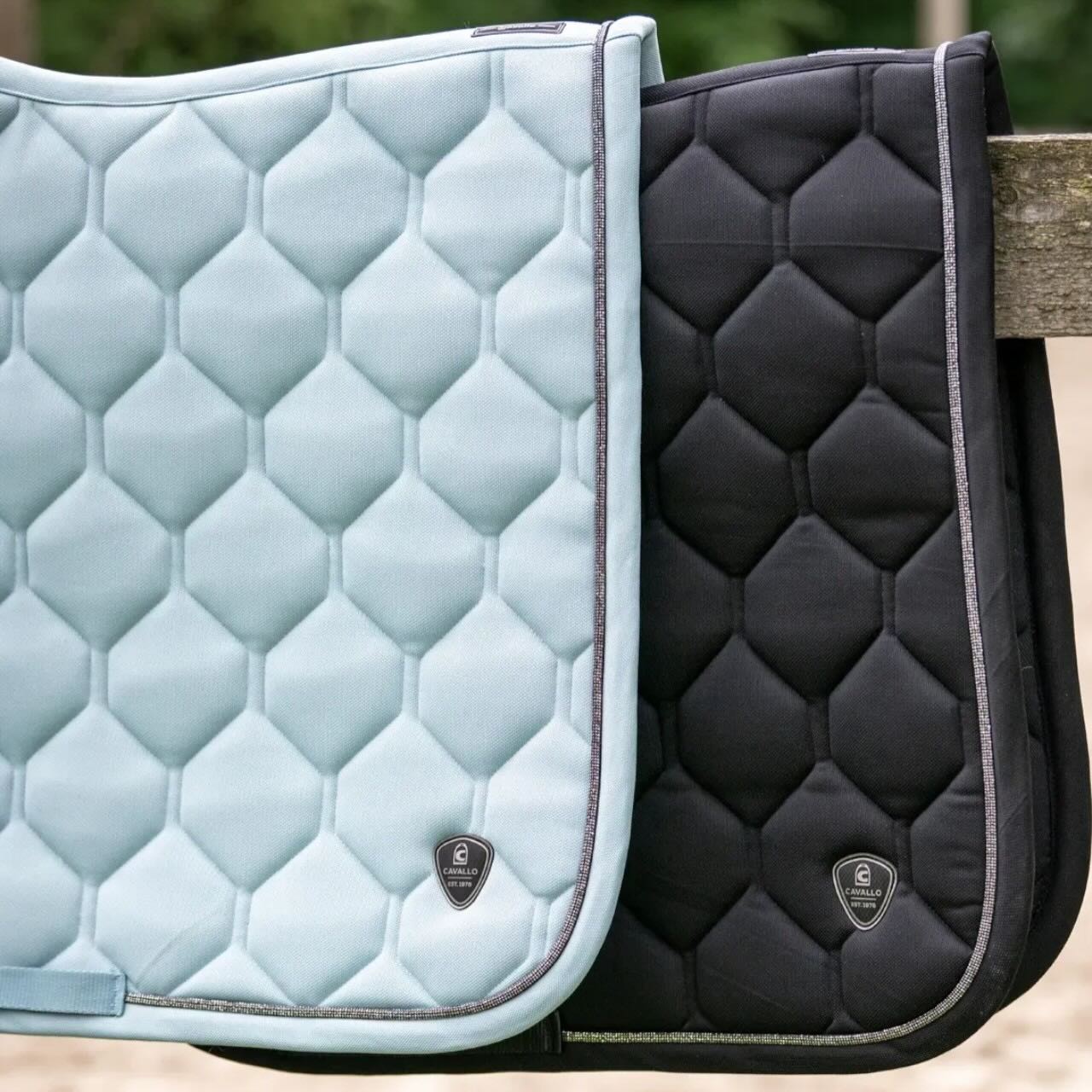 Die Cavallo Dressurschabracke CAVALPRUNE FS 2026 Sattelunterlage überzeugt durch ihr aufwendiges Steppbild in moderner grafischer Optik. Dadurch entsteht eine besonders edle Struktur, die im Stall und auf dem Turnierplatz sofort ins Auge fällt. Ein hochwertiges Kristallband rahmt die Schabracke stilvoll ein und unterstreicht den eleganten Look. Sportive Cavallo-Logo-Patches an den hinteren Ecken sowie auf dem Rücken setzen markentypische Akzente. Diese Details verleihen der Sattelunterlage eine hochwertige und zugleich sportliche Ausstrahlung. So wird dein Pferd auch optisch perfekt für die Dressurarbeit ausgestattet.
