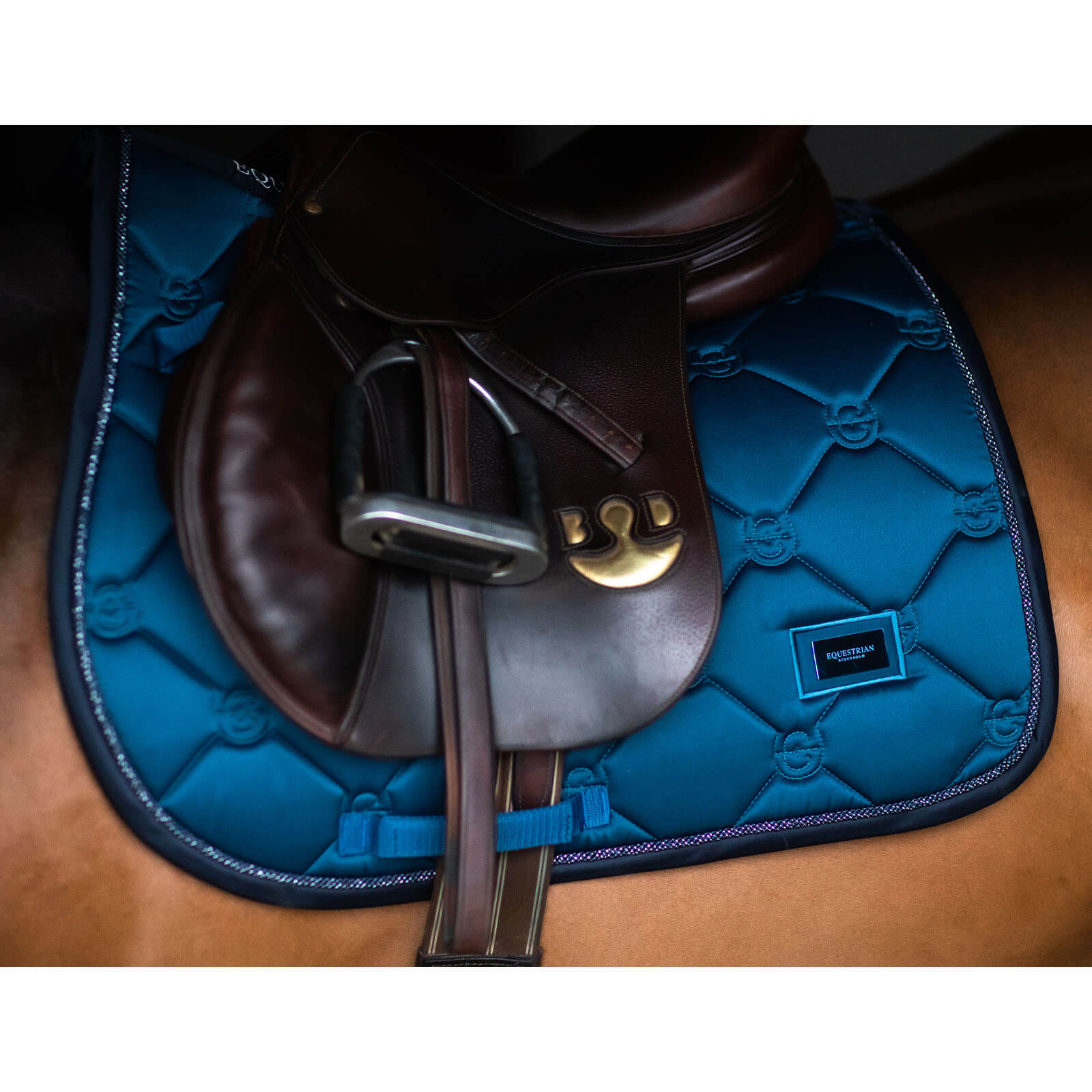 Die Blue Meadow Schabracke besticht durch ihre marineblaue Farbgebung und edle blaue Metallic-Details, die deinem Pferd einen majestätischen Look verleihen. Das ansprechende Design bietet nicht nur optischen Genuss, sondern auch praktische Vorteile, indem es sich harmonisch an den Körper deines Pferdes anpasst und gleichzeitig Bewegungsfreiheit beim Springen gewährleistet.