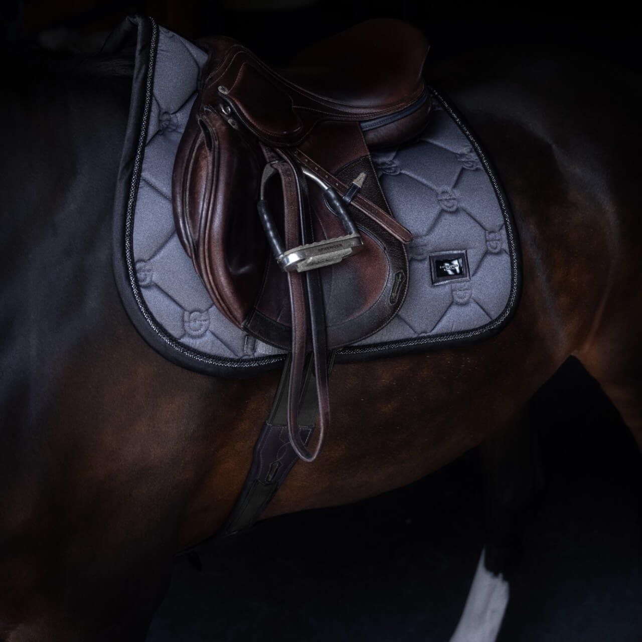 Die Springschabracke Winter Shadow besticht durch ihre graublaue Farbe, ergänzt durch schwarze und silberne Akzente. Diese Farbgebung hebt die Eleganz deines Pferdes auf ein neues Level. Das schwarze Metall-Badge setzt dezente Highlights und macht die Schabracke zum Hingucker auf jedem Reitplatz.