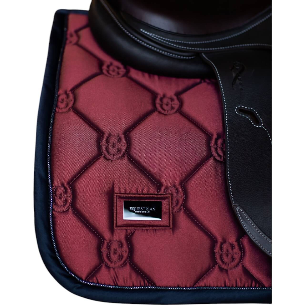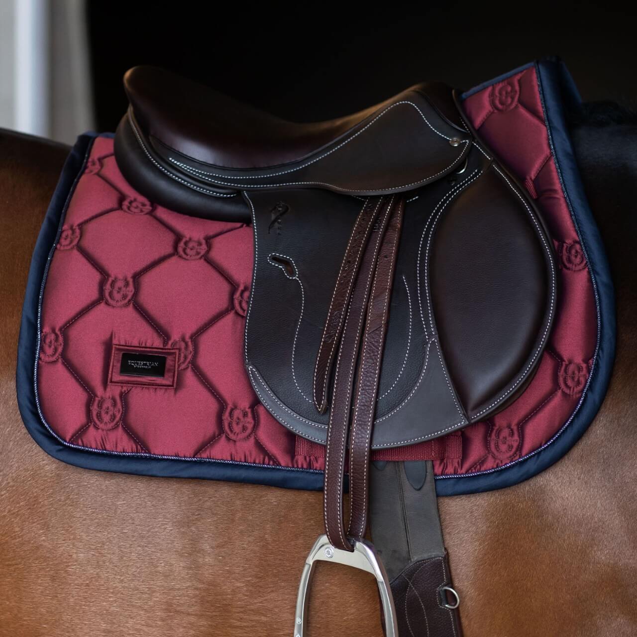 Die Springschabracke Twill Luxe Schabracke beeindruckt mit ihrer modernen Steppung und dem eleganten Farbton Cold Deep Red. Das Navy-Piping mit silbernem Akzent und der schwarze Metall-Badge schaffen einen luxuriösen Look, während das Design nicht nur optisch ansprechend, sondern auch funktional ist.