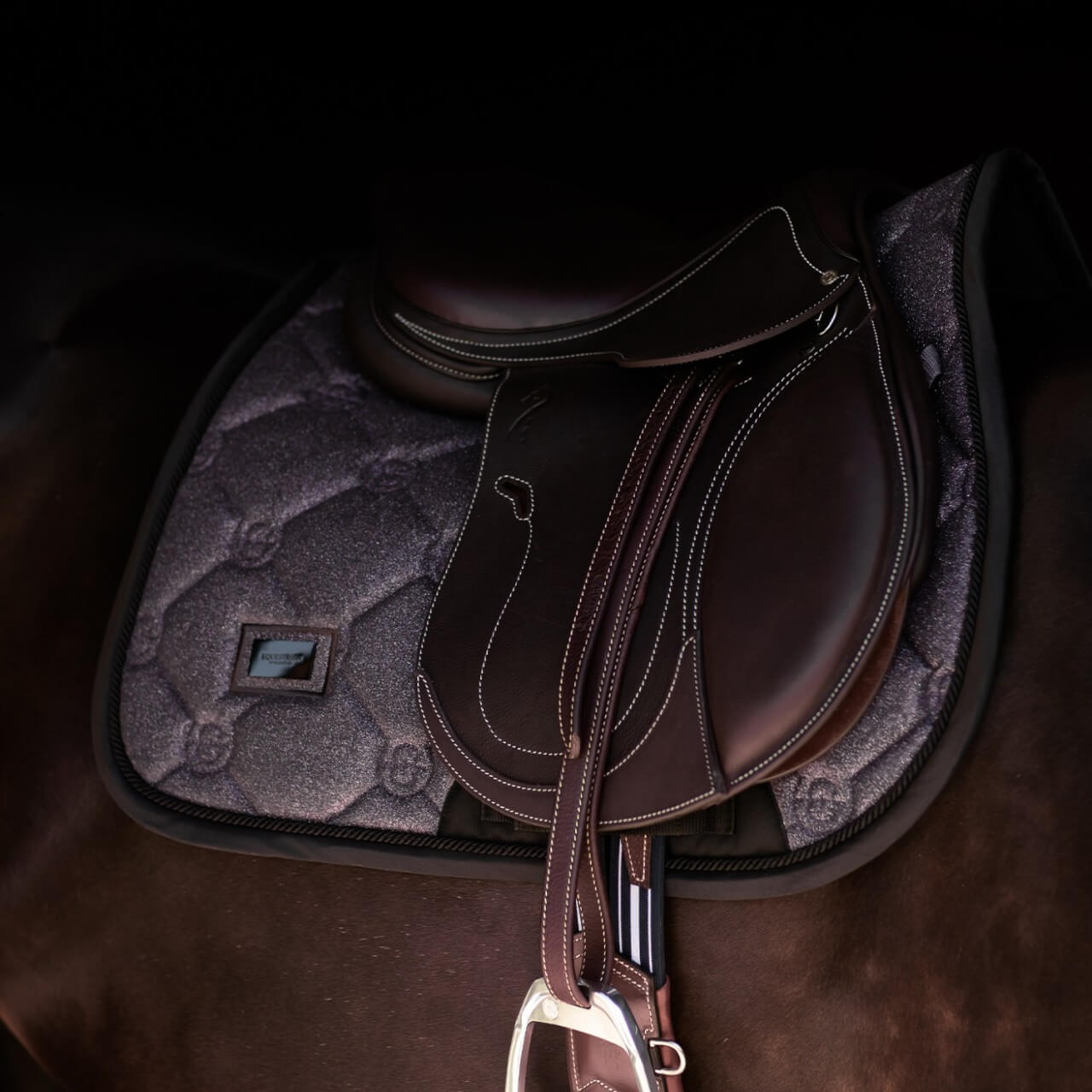 Die visuell beeindruckende Springschabracke Purple Glimmer Schabracke präsentiert sich mit einem luxuriösen lila Glitzerdesign, das durch stilvolle schwarze Details akzentuiert wird. Die moderne Steppung und das silberne Equestrian Stockholm Logo verleihen der Schabracke eine exklusive Note. Dieses stilvolle Design sorgt nicht nur für einen optischen Hingucker, sondern bietet auch praktische Vorteile wie eine robuste Schutzfläche im Gurtbereich, die Abnutzung effektiv reduziert.
