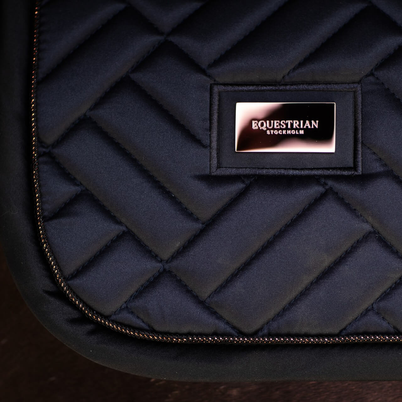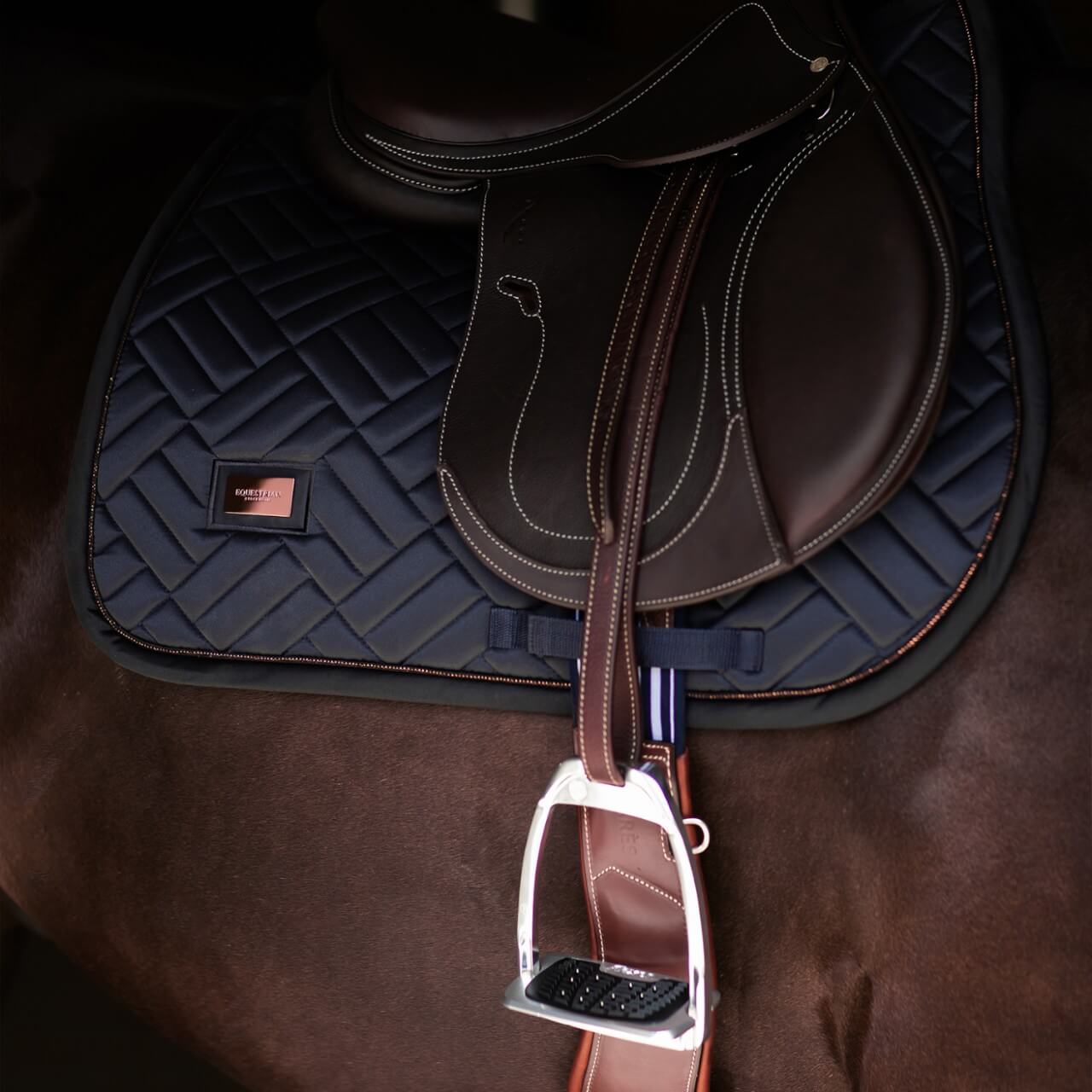 Das tiefdunkle Blau der Springschabracke Jump Saddle Pad Modern Dark Ocean strahlt zeitlose Eleganz aus. Die moderne Steppung und roségoldenen Details verleihen der Schabracke eine exklusive Optik. Die anatomische Form sorgt für eine optimale Anpassung an den Pferderücken und sichert den Sattel in einer stabilen Lage.
