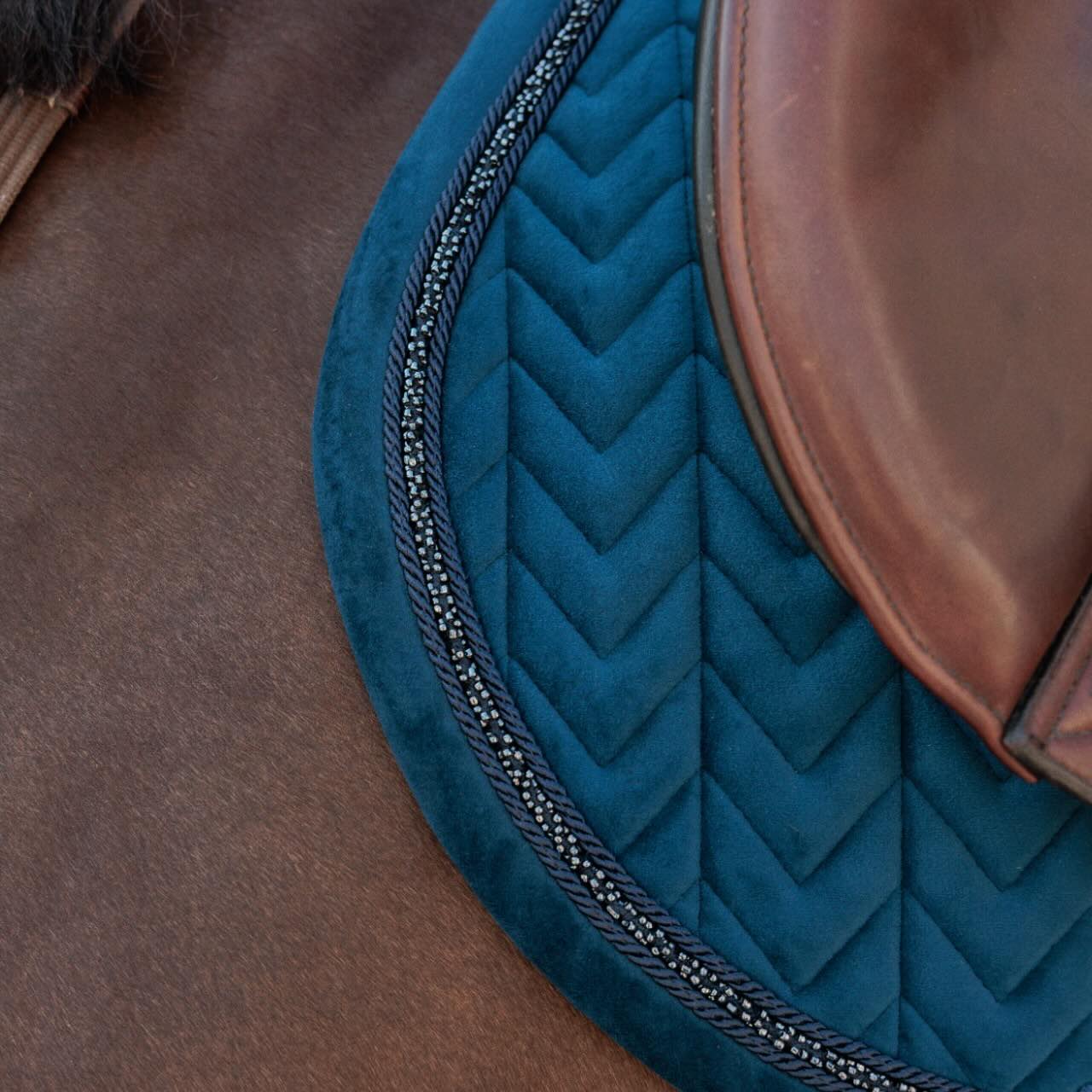 Die Springschabracke Velvet Mini Pearls überzeugt durch ihren hochwertigen Samtstoff, der mit einer charakteristischen Fischgrätsteppung veredelt ist. Die feinen Mini-Perlen setzen dezente Akzente und verleihen der Schabracke einen edlen Glanz. Durch die zeitlose Optik passt sie sowohl ins Training als auch auf Turnieren. Die sorgfältige Verarbeitung sorgt für eine langlebige Qualität. Stilvolle Eleganz wird hier mit funktionalem Nutzen kombiniert. Dein Pferd wird dabei nicht nur gut aussehen, sondern sich auch rundum wohlfühlen.
