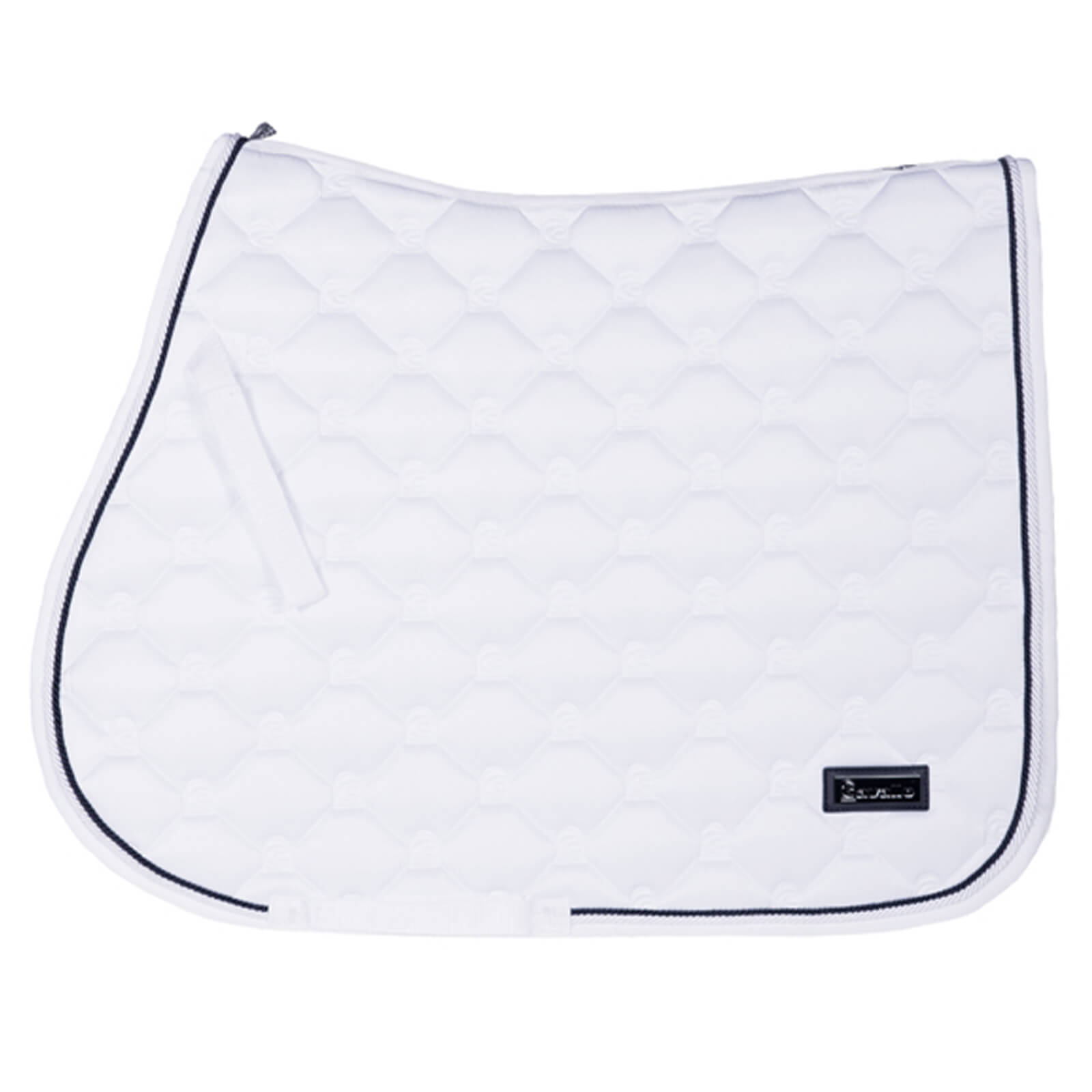 Die Springschabracke CAVALHANAYA besticht durch ihren leicht glänzenden, hochwertigen Stoff, der in einem aufwendigen Rautensteppmuster gehalten ist. Das integrierte Cavallo Logo und das exklusive Label in Gunmetal-Optik unterstreichen den edlen Look. Die matt silberne Kordel verleiht der Schabracke einen zusätzlichen Hauch von Eleganz, während die praktische Form für eine optimale Passform sorgt.