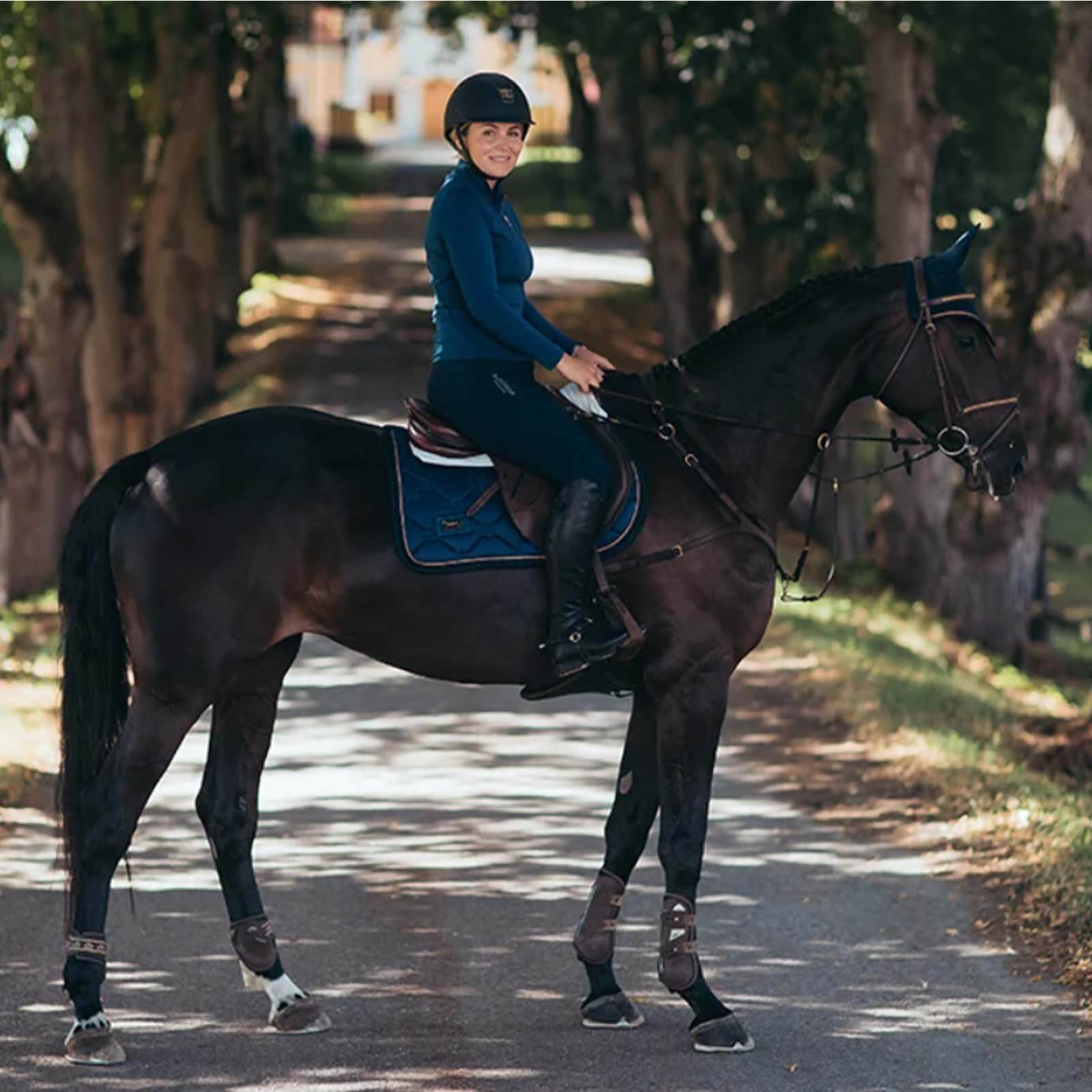Die Springschabracke Monaco Blue HW 2021 besticht durch ihr edles marineblaues Design, das mit roségoldenen und marineblauen Kordeln veredelt ist. Das stilvolle Equestrian Stockholm Abzeichen rundet den Look perfekt ab. Die glänzende, schmutzabweisende Oberfläche sorgt dafür, dass du und dein Pferd stets einen makellosen Auftritt hinlegen könnt.