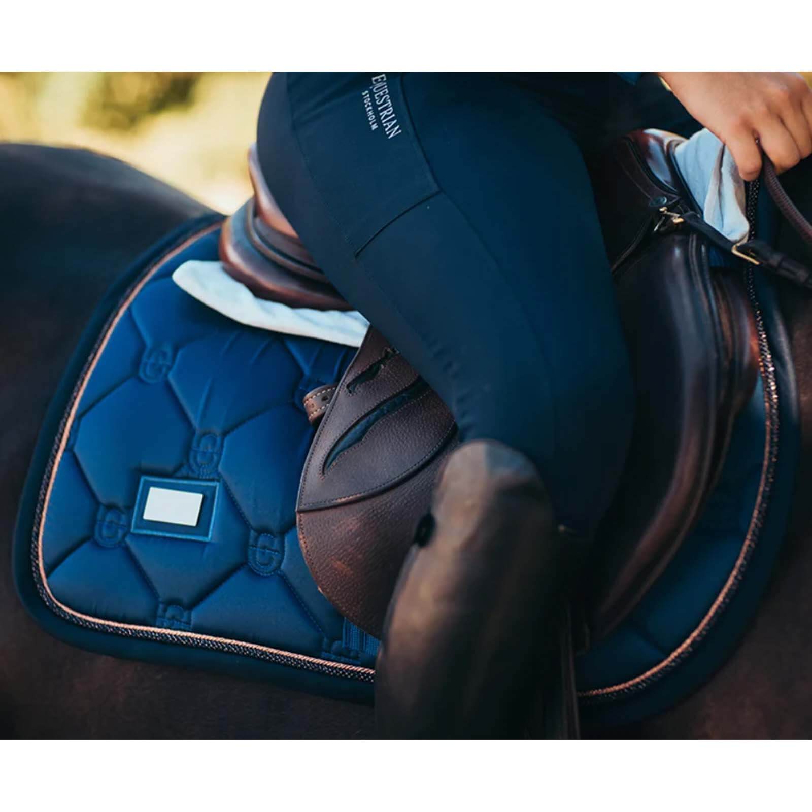 Springschabracke Monaco Blue HW 2021 von Equestrian Stockholm vereint stilvolle Eleganz mit erstklassiger Funktionalität. Das wunderschöne marineblaue Design mit roségoldenen Akzenten sorgt nicht nur für einen exklusiven Look, sondern bietet auch technische Vorteile für anspruchsvolle Reitsportler. Fühl dich wohl bei jeder Trainingseinheit und verleihe deinem Pferd einen Hauch von Luxus.