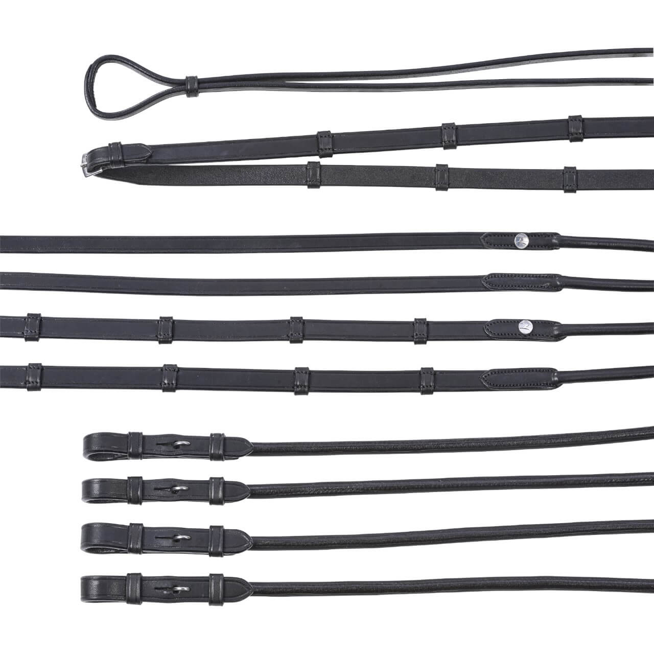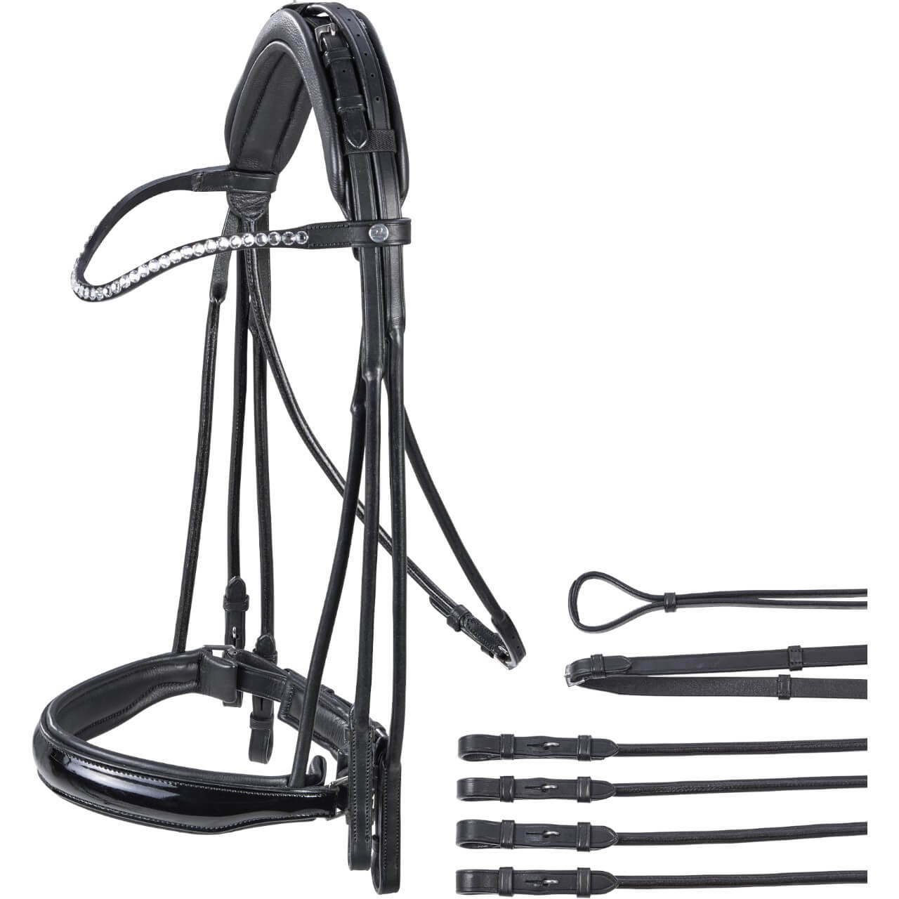 - Reithalfter, Gebissriemen und Kandarengebissriemen durch Elastikband am Genickstück fixierbar, um ein Verrutschen zu verhindern