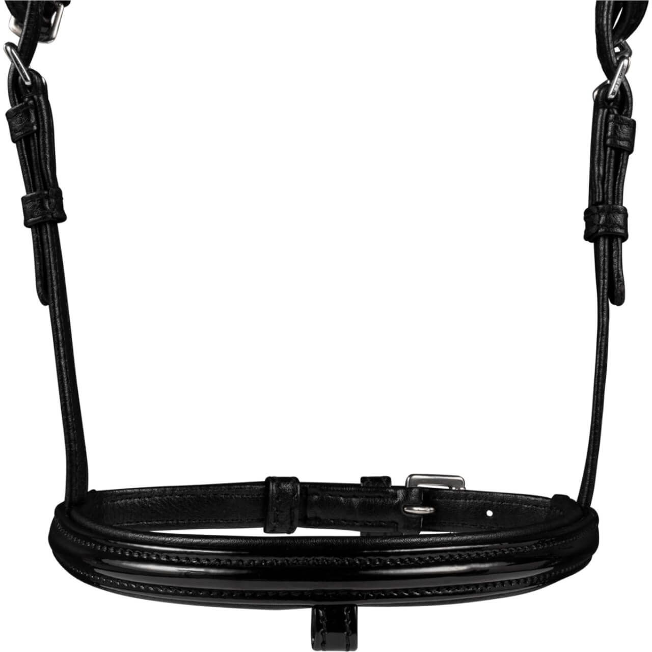 Der Trensenzaum Happy Hearts Trense besticht durch seine elegante Optik: Der gerade Stirnriemen und der Nasenriemen sind mit glänzendem Lack veredelt und zarten rosa Herzchen geschmückt. Diese Kombination aus klassischer Eleganz und verspielten Details macht die Trense zu einem echten Blickfang im Viereck.