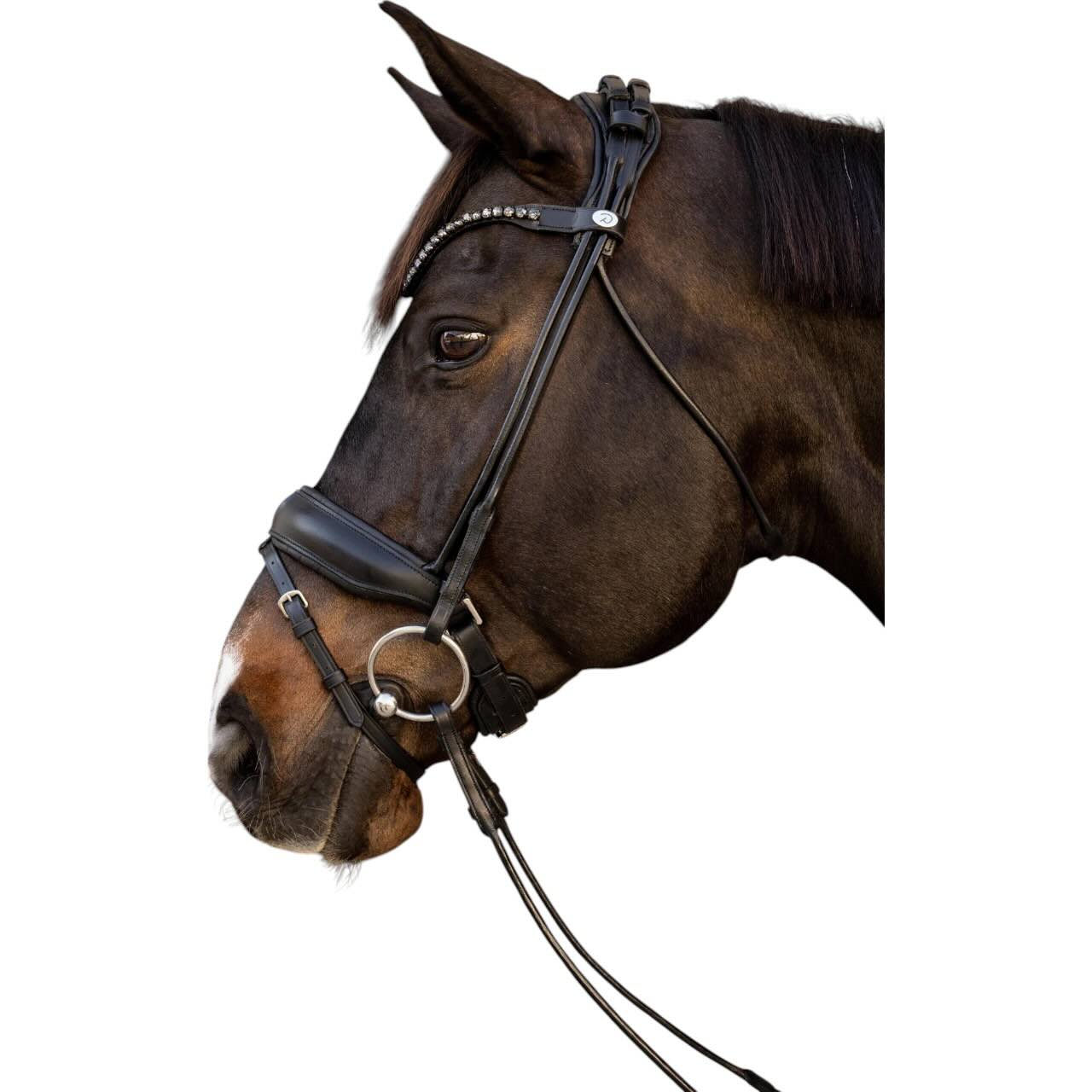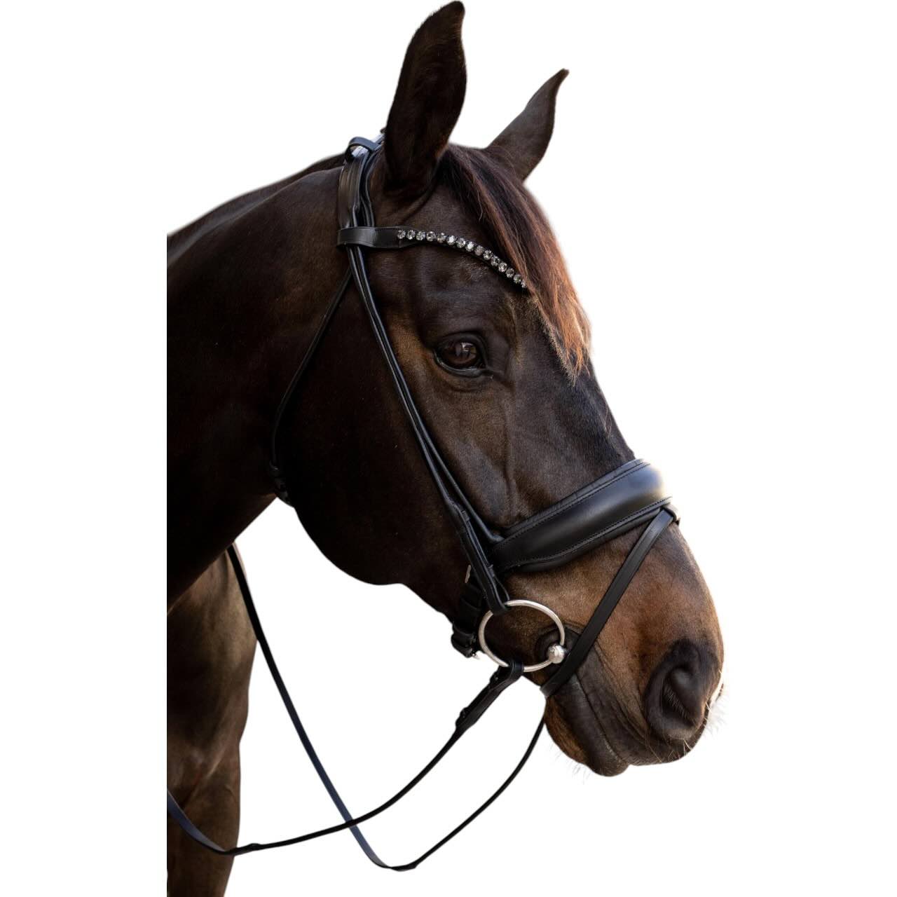 Das V-förmige Stirnband mit funkelnden Kristallen verleiht der Dyon ComfoHead eine elegante Ausstrahlung. Trotz der stilvollen Akzente steht die Funktionalität im Vordergrund – ideal für den anspruchsvollen Reiteralltag. Dank der intelligenten Schnittführung passt sich die Trense perfekt an die Kopfform deines Pferdes an. Die flexiblen Einstellungsmöglichkeiten helfen, selbst empfindliche Pferde komfortabel zu versorgen. Dabei bleiben Kontrolle und Kommunikation mit dem Pferd jederzeit fein und präzise. Diese Trense ist damit die ideale Wahl für Reiter, die weder beim Komfort noch beim Design Kompromisse eingehen möchten.