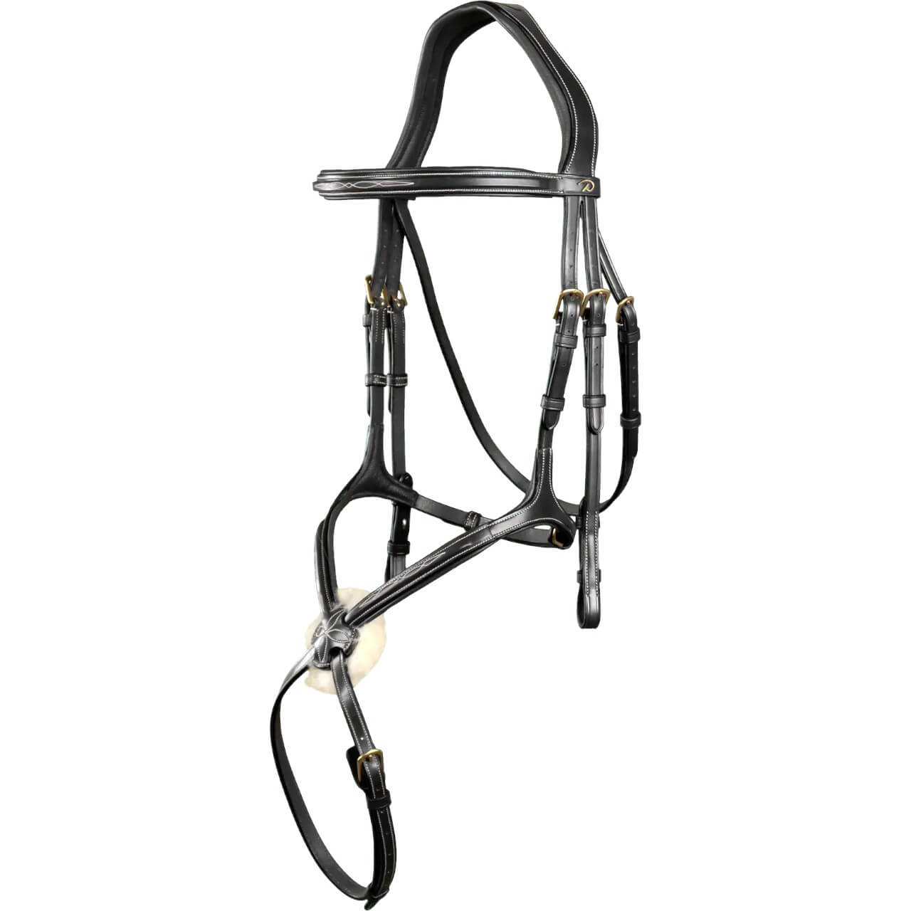 Die Dy'on Trense besticht durch ihr elegantes, leicht quadratisch angehobenes Stirn- und Nasenriemen-Design, verziert mit dekorativen Ziernähten. Das figure-8-Nasenband ohne Ringe bietet nicht nur einen edlen Look, sondern verhindert auch Druckstellen, indem es sich optimal an die Gesichtskonturen deines Pferdes anpasst.