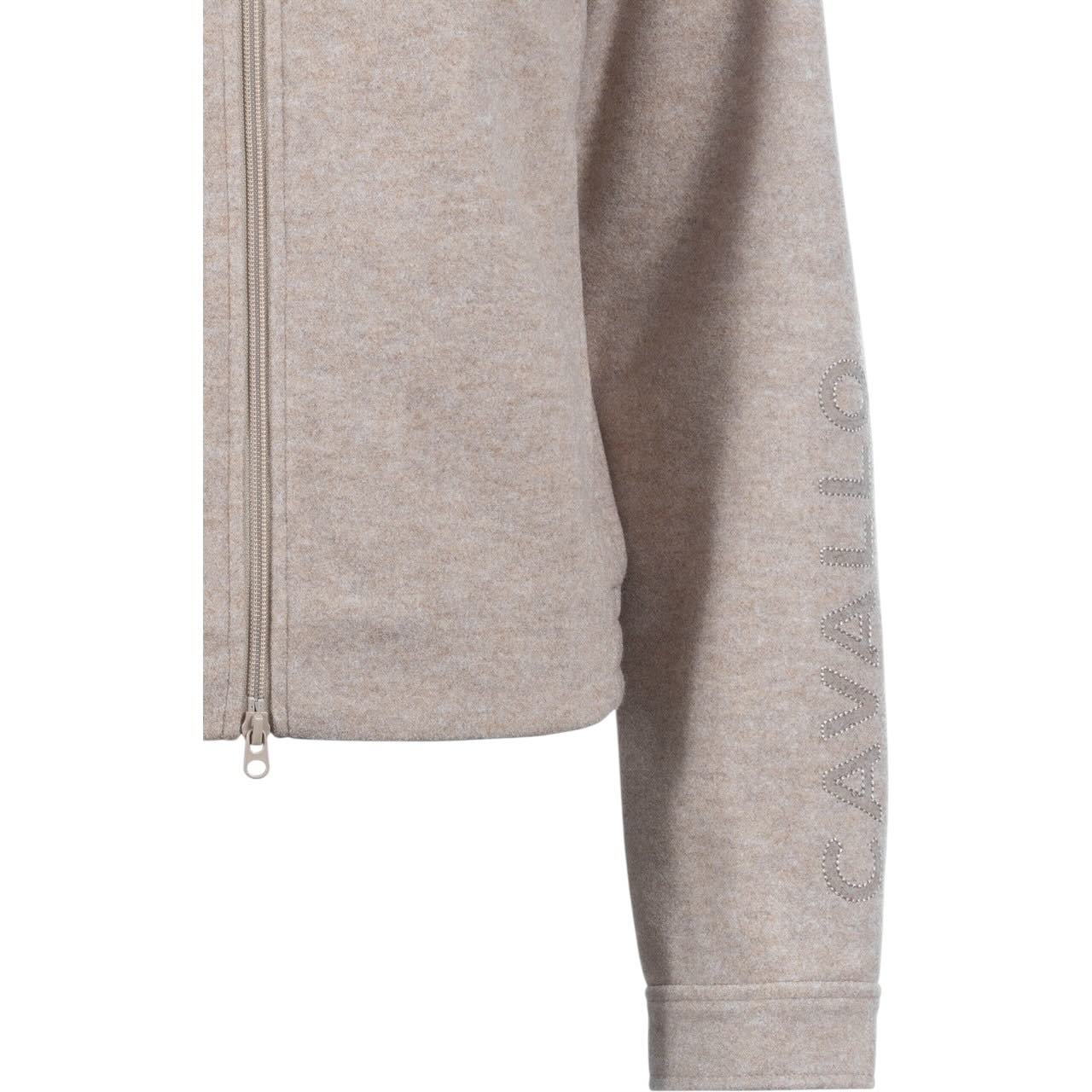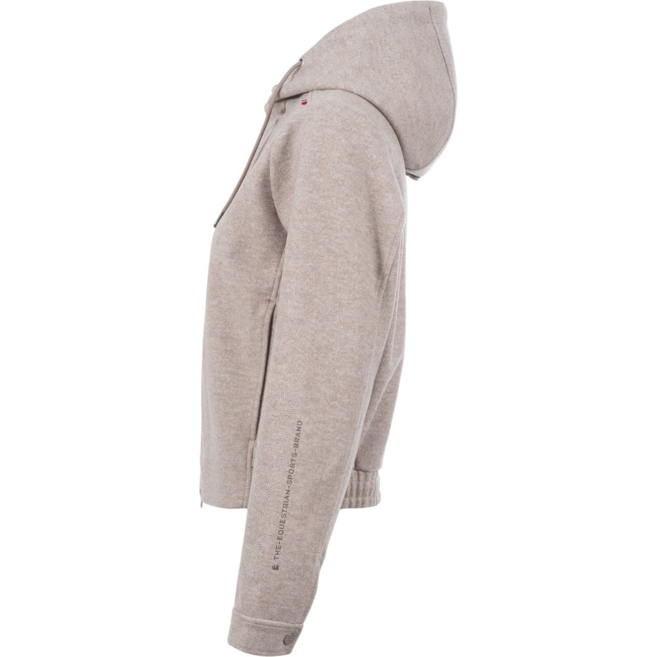 Die Cavallo Sweatjacke Cavalrabi HW 2025 präsentiert sich im trendigen Boxy-Schnitt mit klaren Linien und einer sportlichen Kapuze. Die Außenware in edler Wolloptik sorgt für ein hochwertiges Erscheinungsbild mit weichem Griff. Die Kapuze ist mit einem tonigen Kordelzug ausgestattet und kann per Druckknopf am Rücken fixiert werden – ideal bei Wind oder im Sattel. Tonige Cavallo-Details wie die Steigbügel-Stickerei auf der Brust und das markante Artwork auf dem linken Unterarm unterstreichen den sportlich-eleganten Charakter. So erhält die Jacke eine klare Formensprache, die sich vielseitig kombinieren lässt.