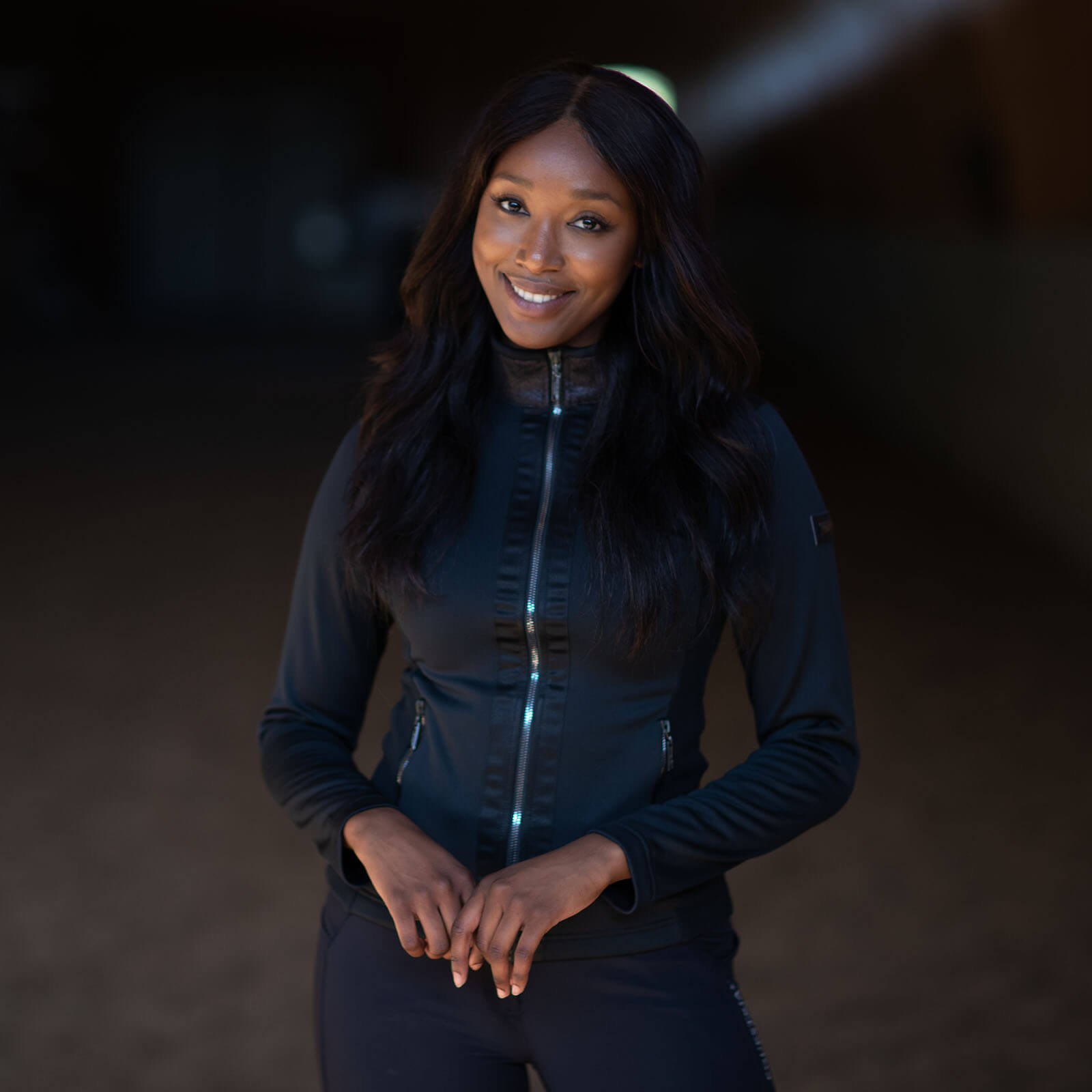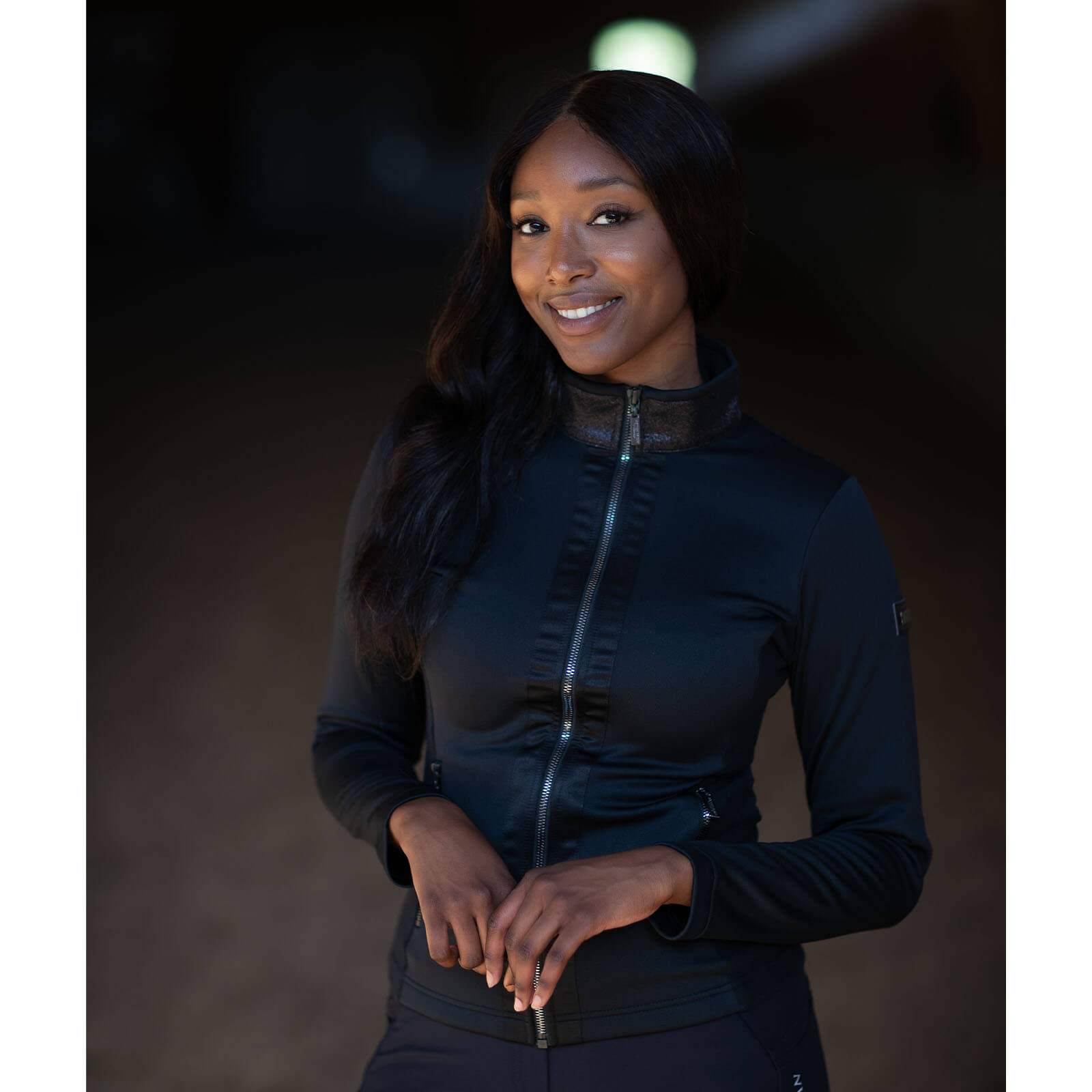 Die Jacke besticht durch ihr tiefschwarzes Design mit funkelnden Glimmer- und Chromdetails, die einen Hauch von Luxus in deinen Reitalltag bringen. Die taillierte Passform sorgt nicht nur für eine schmeichelhafte Silhouette, sondern bietet auch maximale Bewegungsfreiheit im Sattel und am Boden.