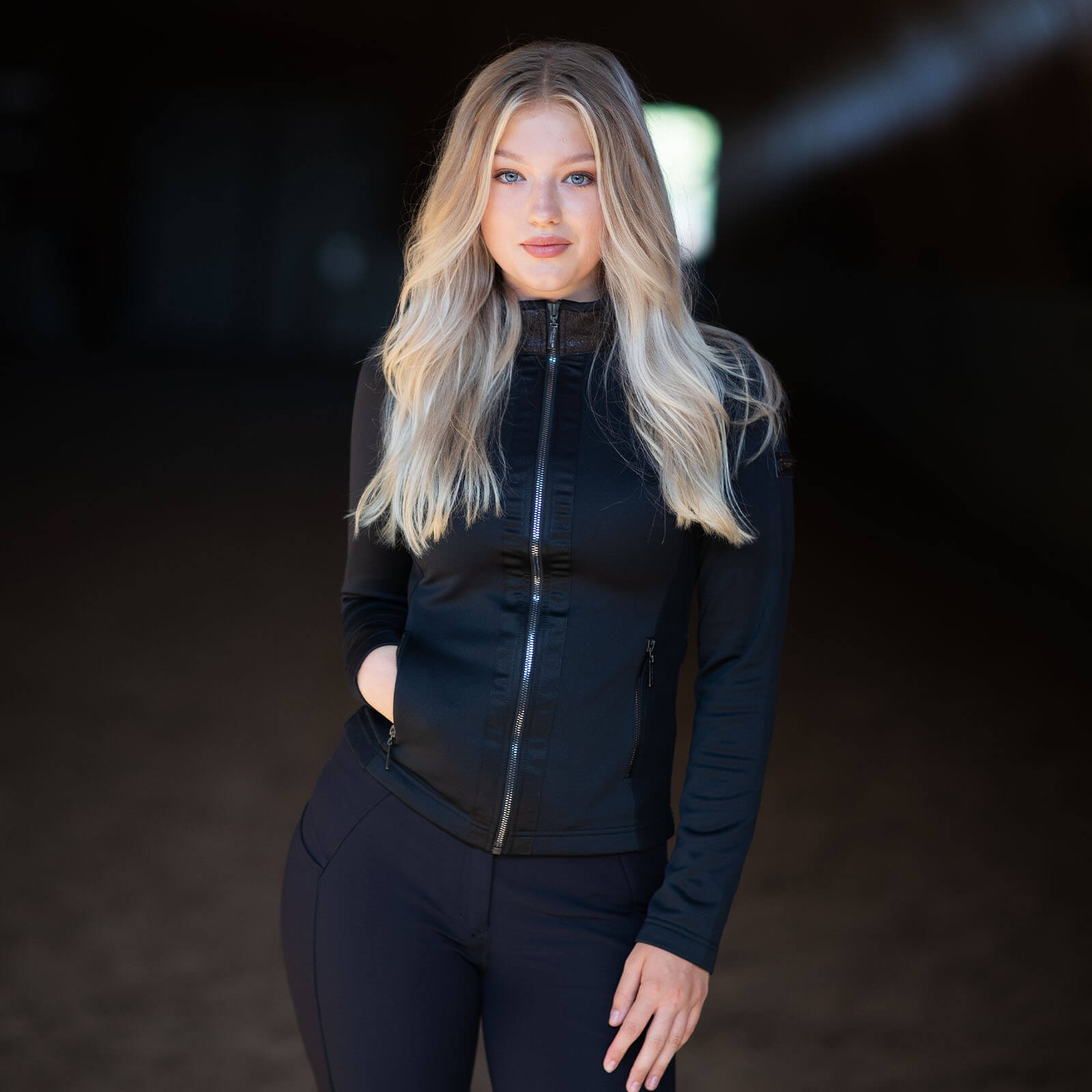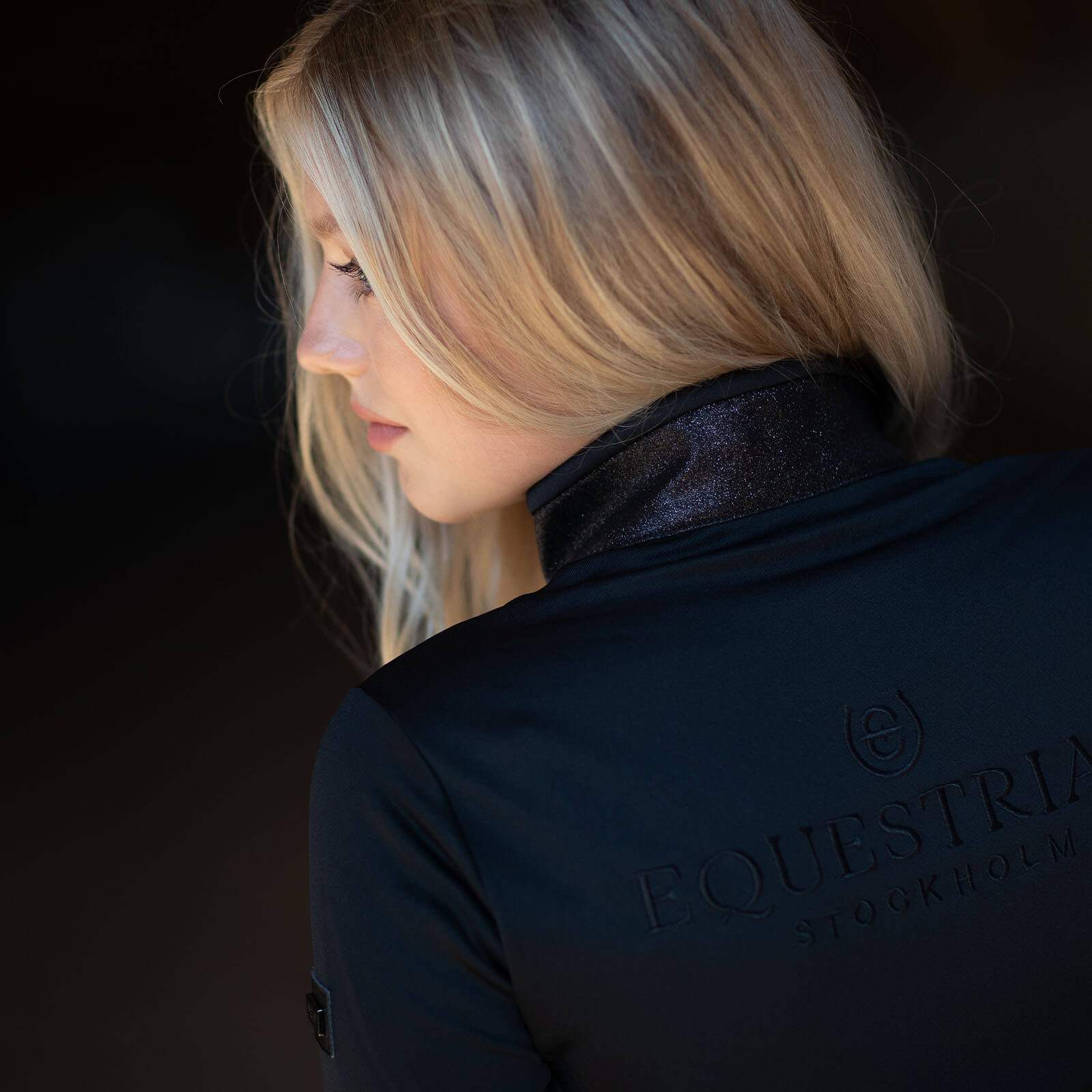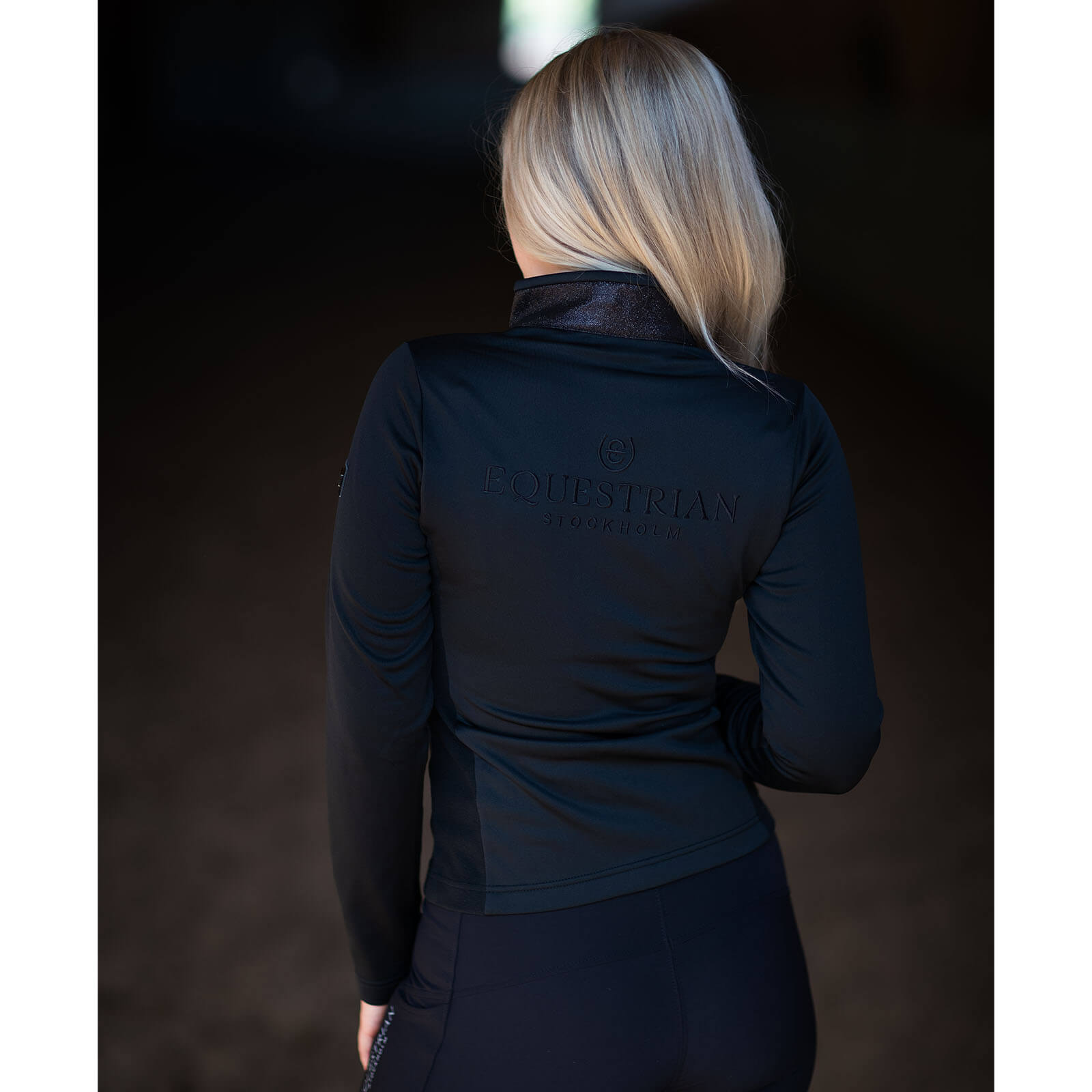 Jacke Damen All Black Glimmer HW 2022 Fleecejacke von Equestrian Stockholm vereint stilvolles Design mit praktischen Vorteilen. Diese umweltfreundliche Fleecejacke ist perfekt für kühle Stallmorgen und hält dich dank ihrer einzigartigen Anti-Geruchs-Wirkung länger frisch. Entdecke die perfekte Mischung aus Eleganz und Funktionalität, die dich modisch und komfortabel durch den Tag begleitet.