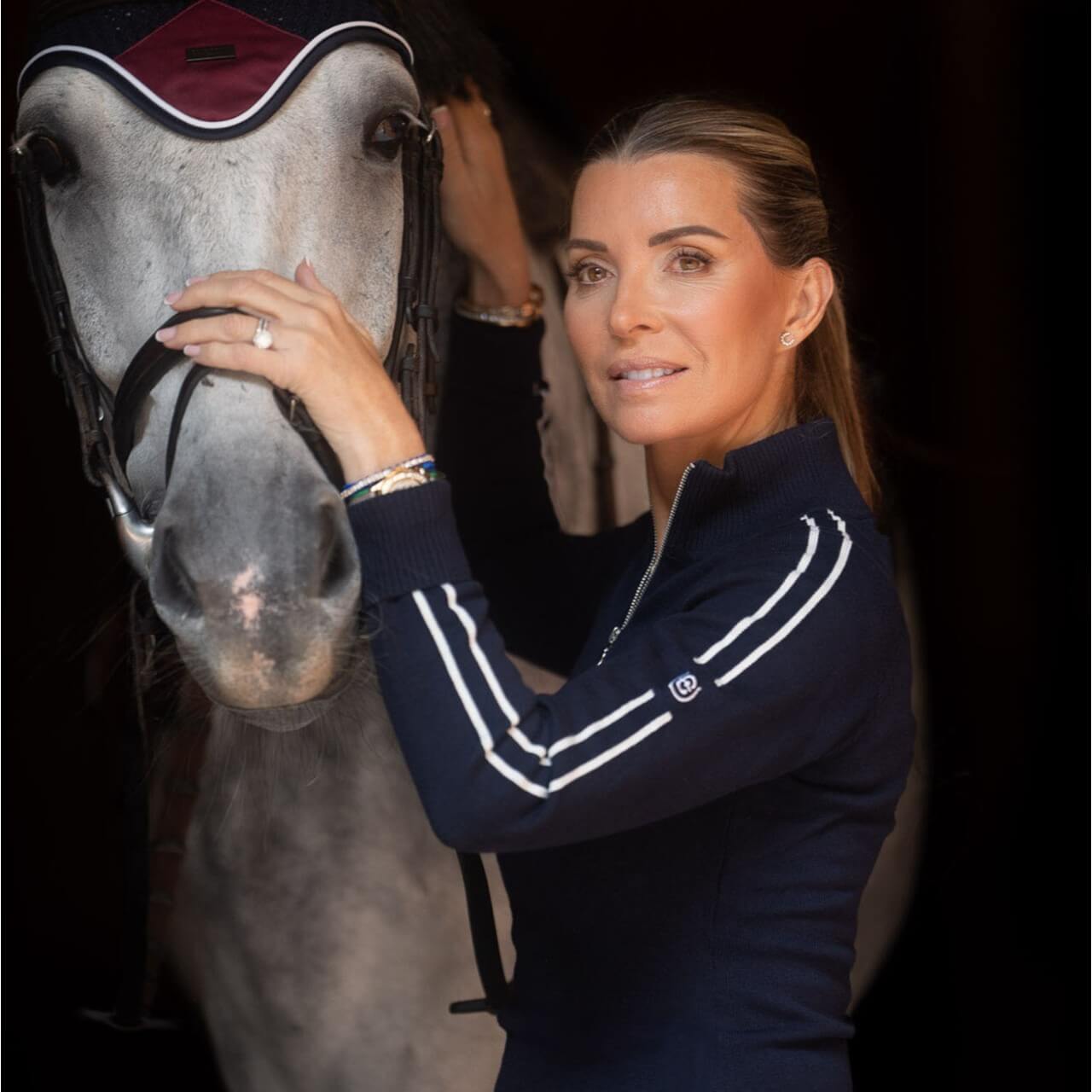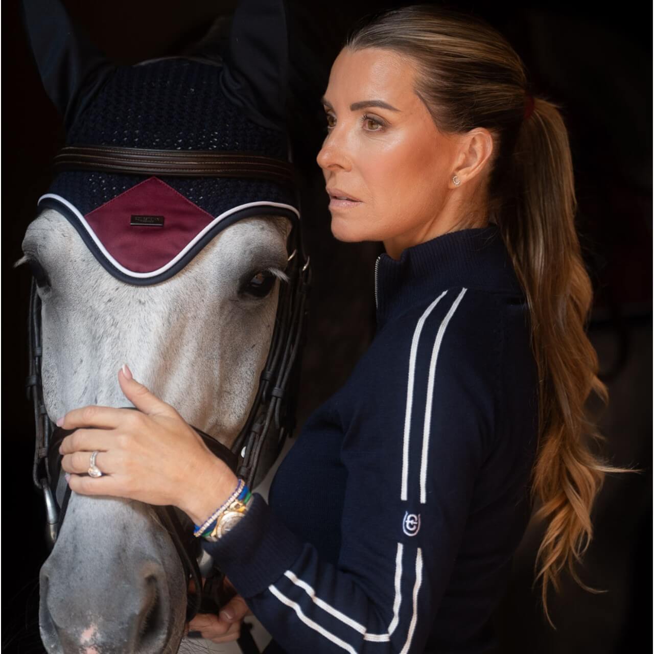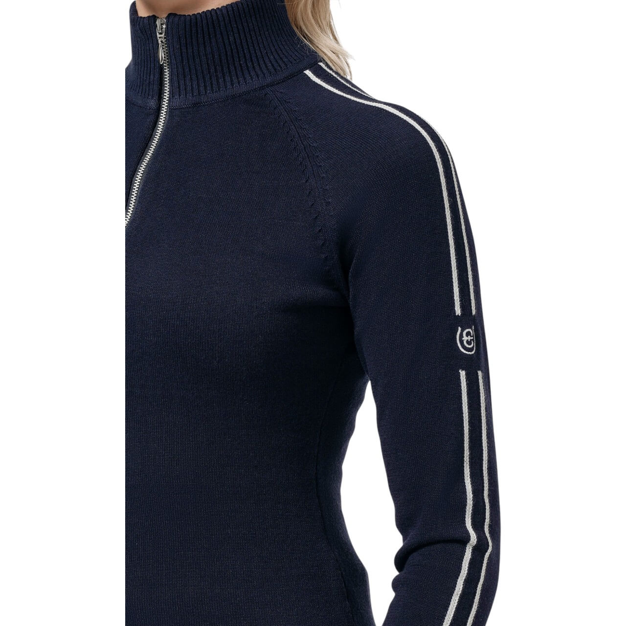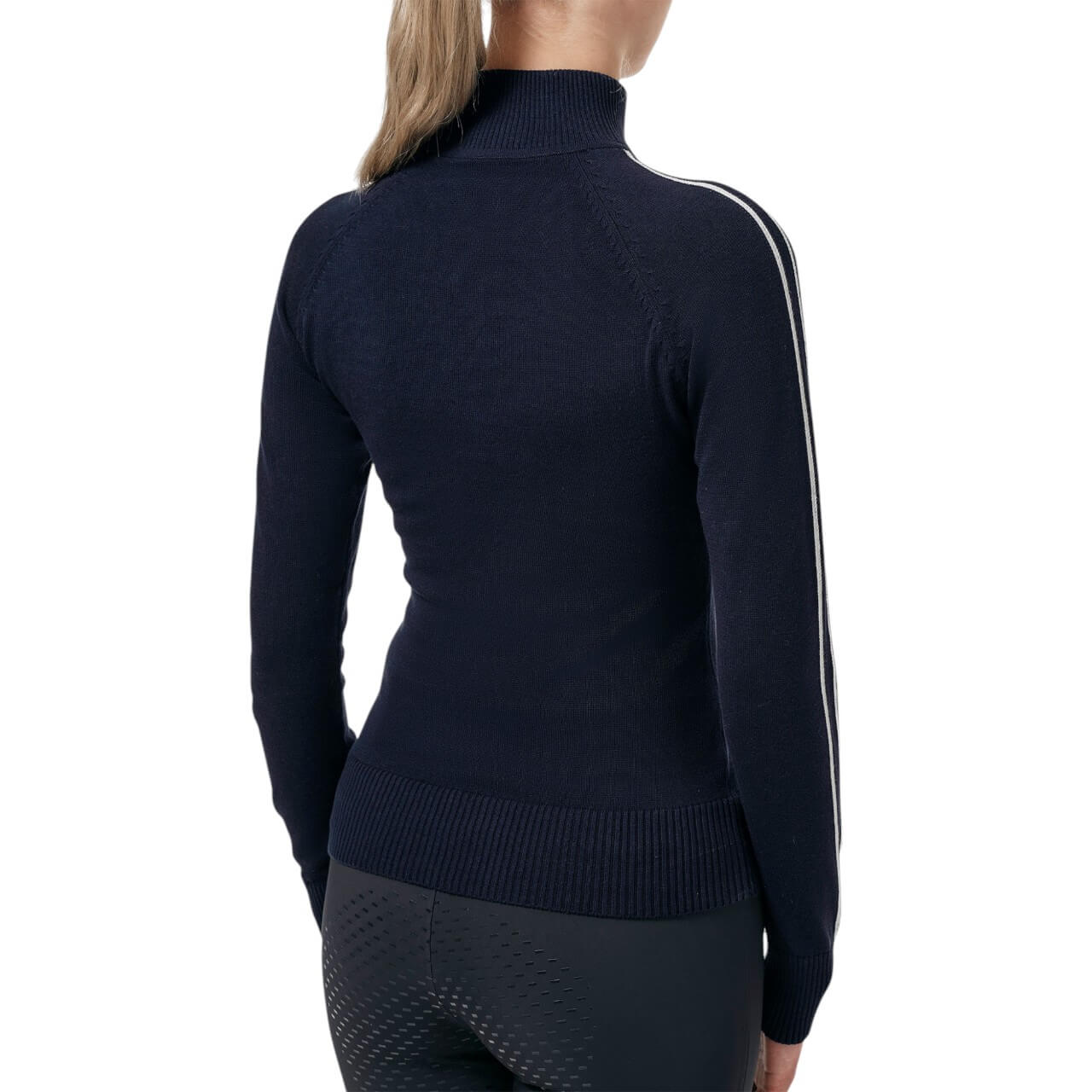 Der Pullover Fine Knit Luxe Half-Zip besticht durch sein elegantes Design in Navy und Weiß, das sich mühelos in deine Reitsport-Garderobe einfügt. Der halbe Reißverschluss bietet nicht nur einen modernen Look, sondern auch praktische Belüftung. Das gestickte Equestrian Stockholm-Logo auf dem linken Ärmel verleiht dem Pullover eine exklusive Note.
