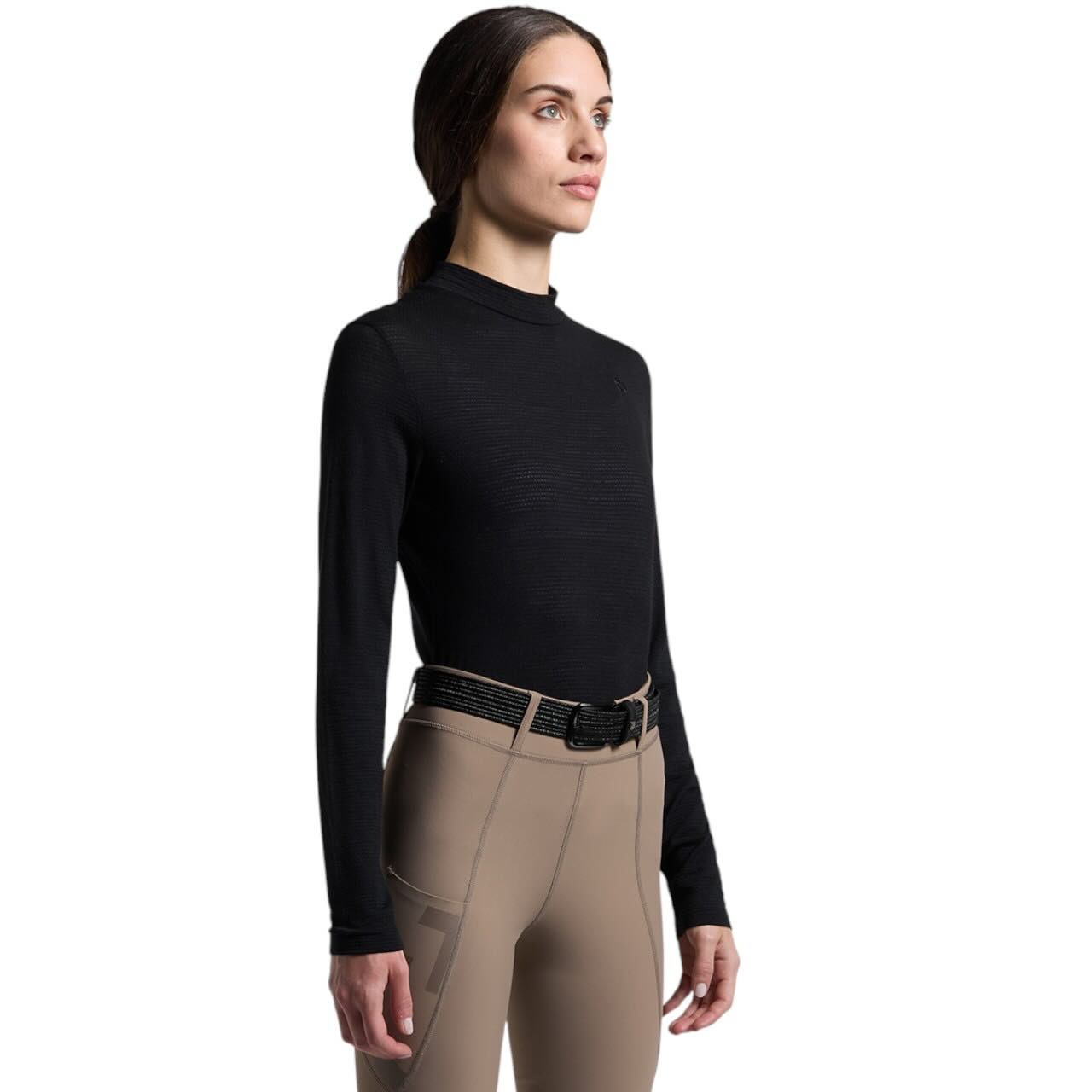 Das Baselayer überzeugt durch sein schlichtes, klares Design, das Funktionalität und Eleganz verbindet. Der hoch geschnittene Kragen schützt zuverlässig vor Wind und Wetter, während der figurbetonte Schnitt eine sportlich-edle Silhouette unterstreicht. Auf der Brust befindet sich ein Ton-in-Ton-Logo, das dem Shirt eine dezente Raffinesse verleiht. Saubere Linien und ein minimalistischer Look machen es vielseitig kombinierbar. Ob beim Training oder im Stallalltag – das Langarmshirt ist ein modisches Statement.
