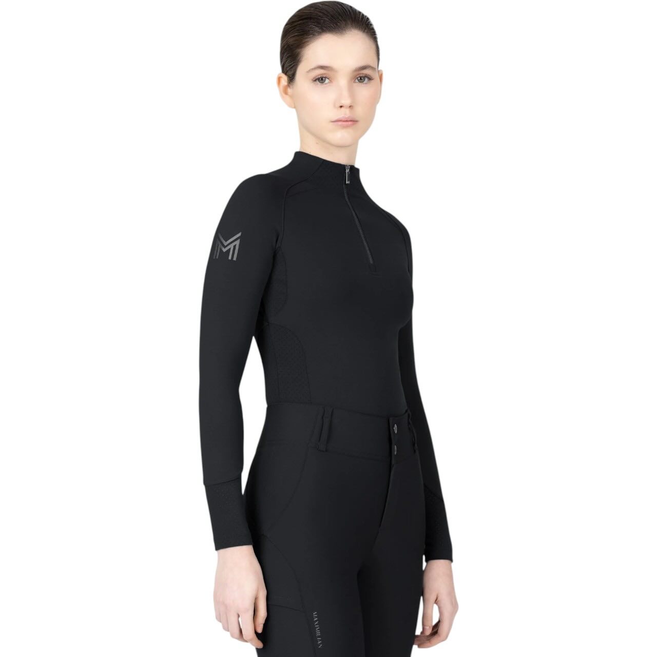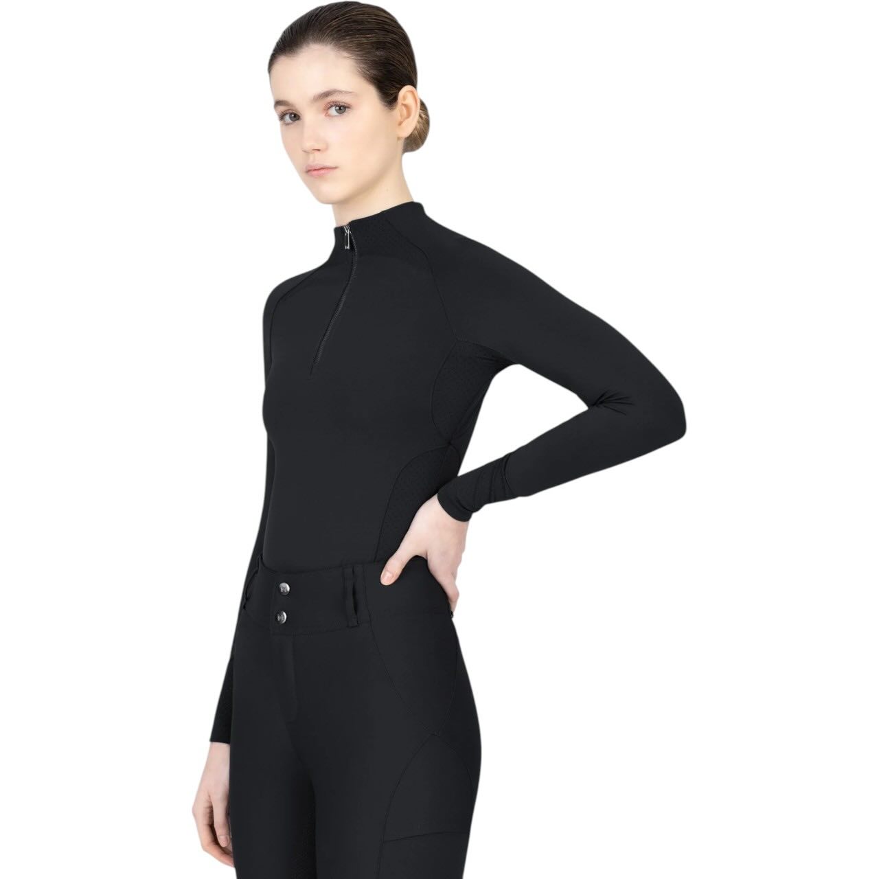 Das hochwertige Stretchmaterial passt sich deinem Körper optimal an und bietet uneingeschränkte Bewegungsfreiheit. Die ergonomisch geformte Schnittführung sorgt für eine sportliche Silhouette. Dank schnelltrocknender Eigenschaften ist das Shirt ideal für tägliches Training geeignet. Der flexible Kragen mit Reißverschluss ermöglicht individuelles Anpassen der Belüftung. Auch bei langen Reiteinheiten bleibt der Tragekomfort konstant hoch. Die bewährte Passform basiert auf beliebten Maximilian Base Layern.