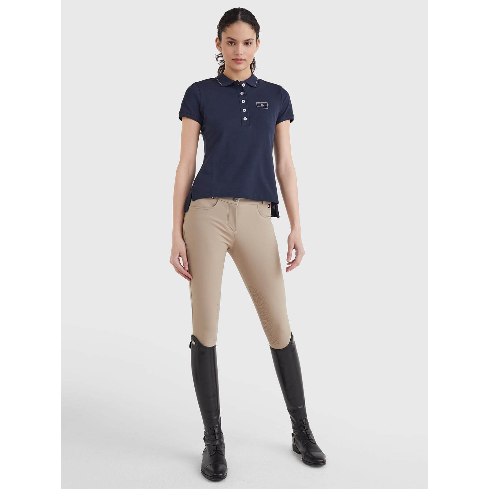 Das Poloshirt besticht durch sein modernes Design in den Farben Desert Sky und TH Optic White. Die Strassstein-Applikationen um den Kragen und das ikonische Tommy Hilfiger Logo auf der Brust setzen funkelnde Akzente, die deinen Look auf dem Reitplatz und darüber hinaus perfektionieren. Das elegante Erscheinungsbild wird durch die lange Knopfleiste ergänzt, die sowohl Stil als auch Funktionalität bietet.