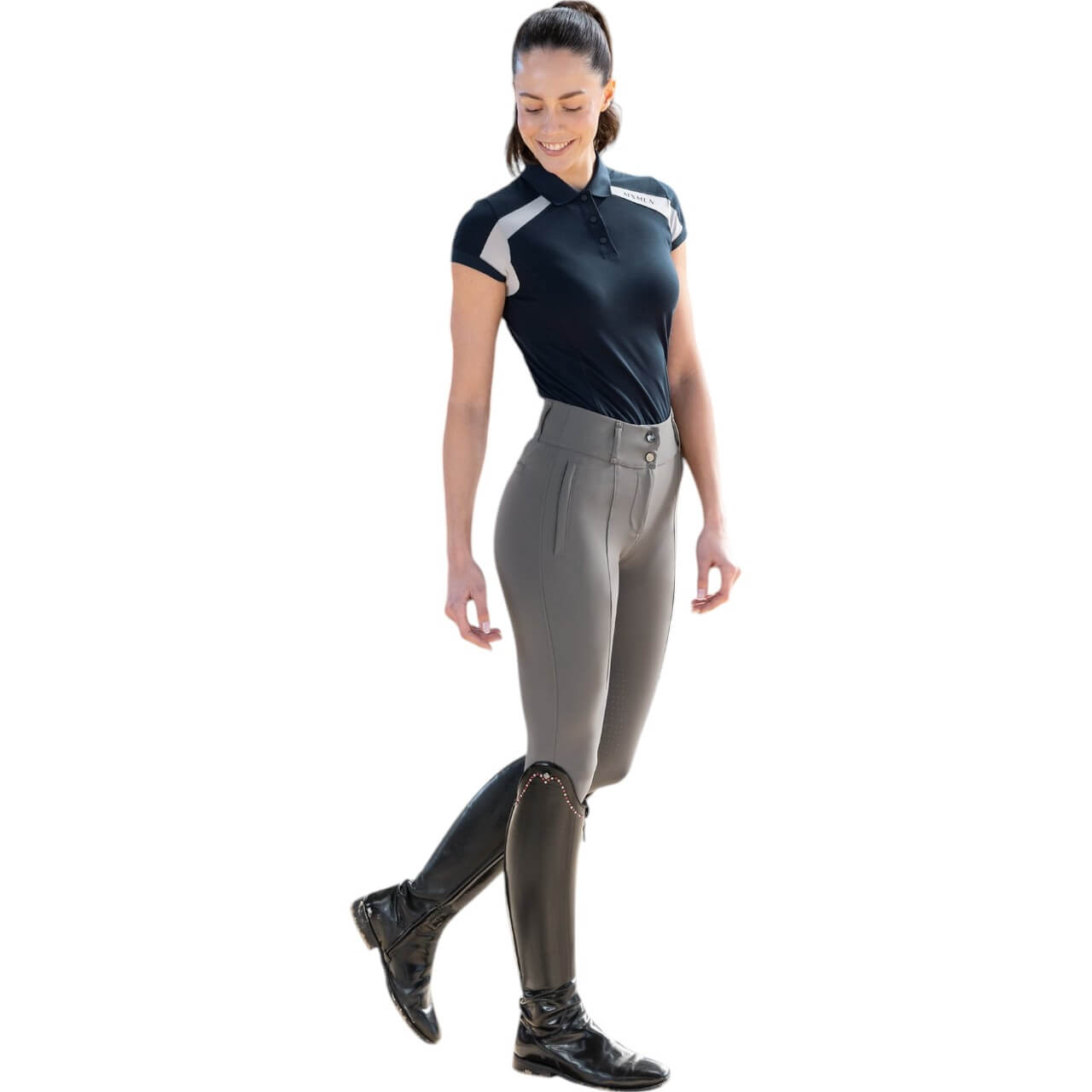 Das Aveen Polo Shirt besticht durch seinen femininen, sportlichen Schnitt, der deine Silhouette elegant betont. Die subtilen mattierten Logo-Details und der Easy-click Kragen verleihen dem Shirt eine edle Note. Das Design bietet nicht nur optische Vorteile, sondern auch praktische Funktionen, die im Reitsport entscheidend sind.