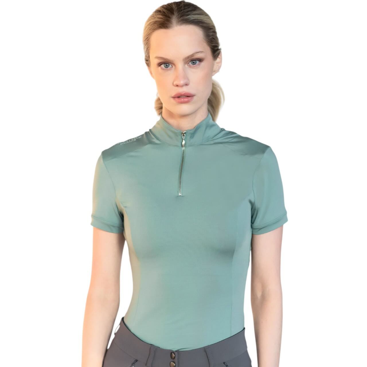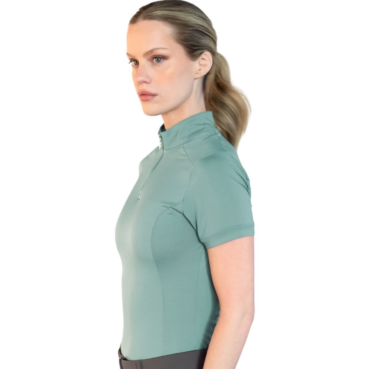 Equestrian Stockholm Baselayer Damen Shortsleeve UV Protection Mint Green T-Shirt ist die ideale Wahl für anspruchsvolle Reiterinnen, die Wert auf Komfort, Funktionalität und nachhaltige Materialien legen. Das atmungsaktive Trainingsshirt schützt dich zuverlässig vor UV-Strahlen und sieht dabei auch noch stilvoll aus.