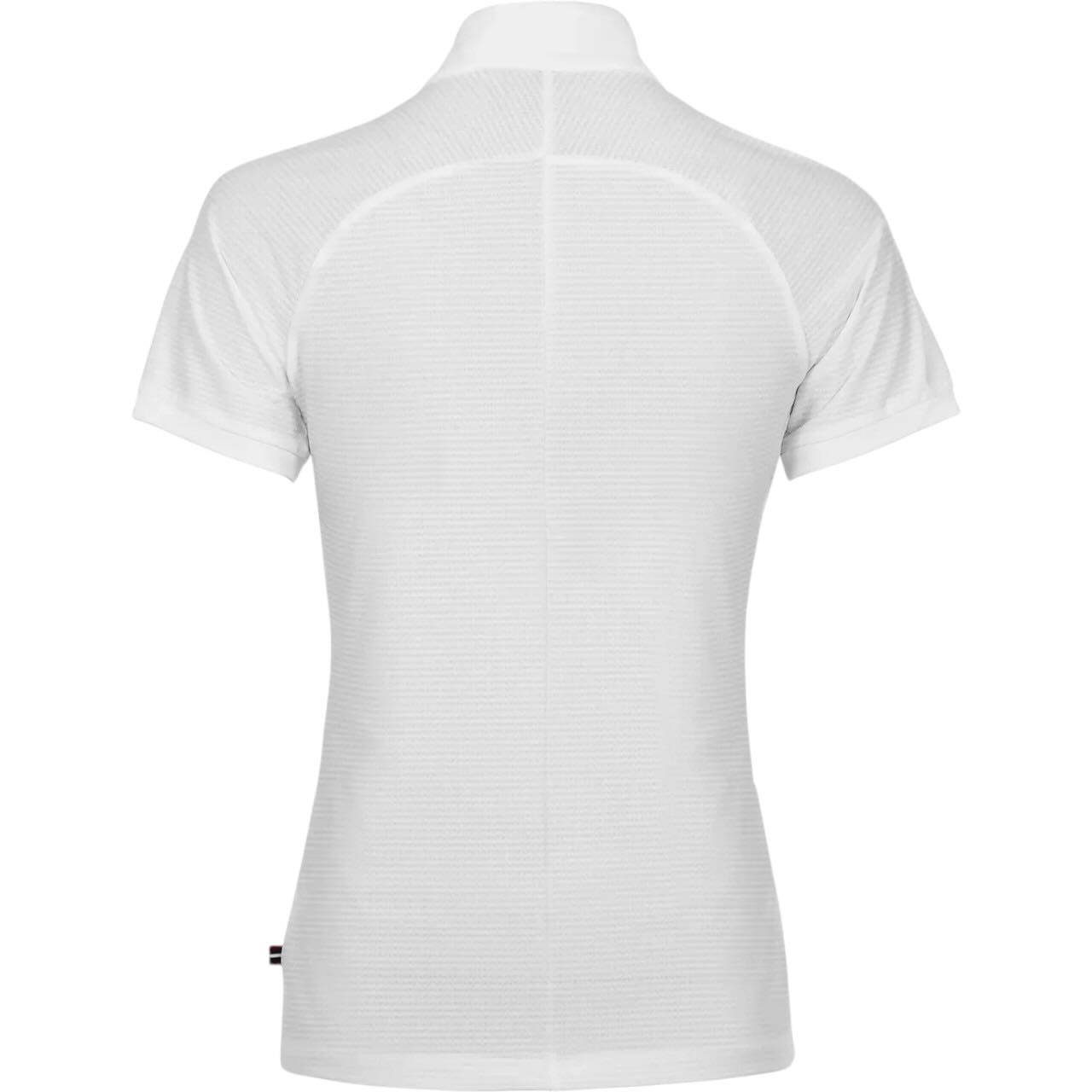 Optisch überzeugt das Shirt mit einer kurzen Knopfleiste mit verdeckten Druckknöpfen. Diese wird durch funkelnde Kristallsteine stilvoll veredelt. Der klassische Stehkragen sowie die vordere Passe sind stets in Weiß gehalten und unterstreichen den Turniercharakter. Ein zarter herzförmiger Ausschnitt an der Front sorgt für eine feminine Note. Der silberfarbene Cavallo-Druck auf Brust und Seite setzt dezente Markenakzente. Dadurch entsteht ein harmonischer Look, der sportlich und elegant zugleich wirkt.
