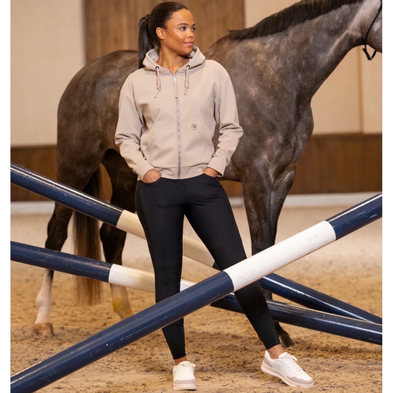 Innenliegendes elastisches Bundgummi mit Antislip-Print verhindert ein Verrutschen und steigert den Tragekomfort. Die runden Einschubtaschen sind mit funkelnden Silikon-Rhinestone-Applikationen verziert und setzen dezente Akzente. Fake-Pattentaschen auf der Rückseite unterstreichen den eleganten Look. Beidseitige Pikeur-Athleisure-Prints am Beinabschluss runden das sportlich-edle Design ab. Die Kombination aus Funktion und Stil macht diese Leggings zur idealen Wahl für Training und Freizeit. So bist du im Stall, auf dem Turnier oder beim Ausritt bestens ausgestattet.