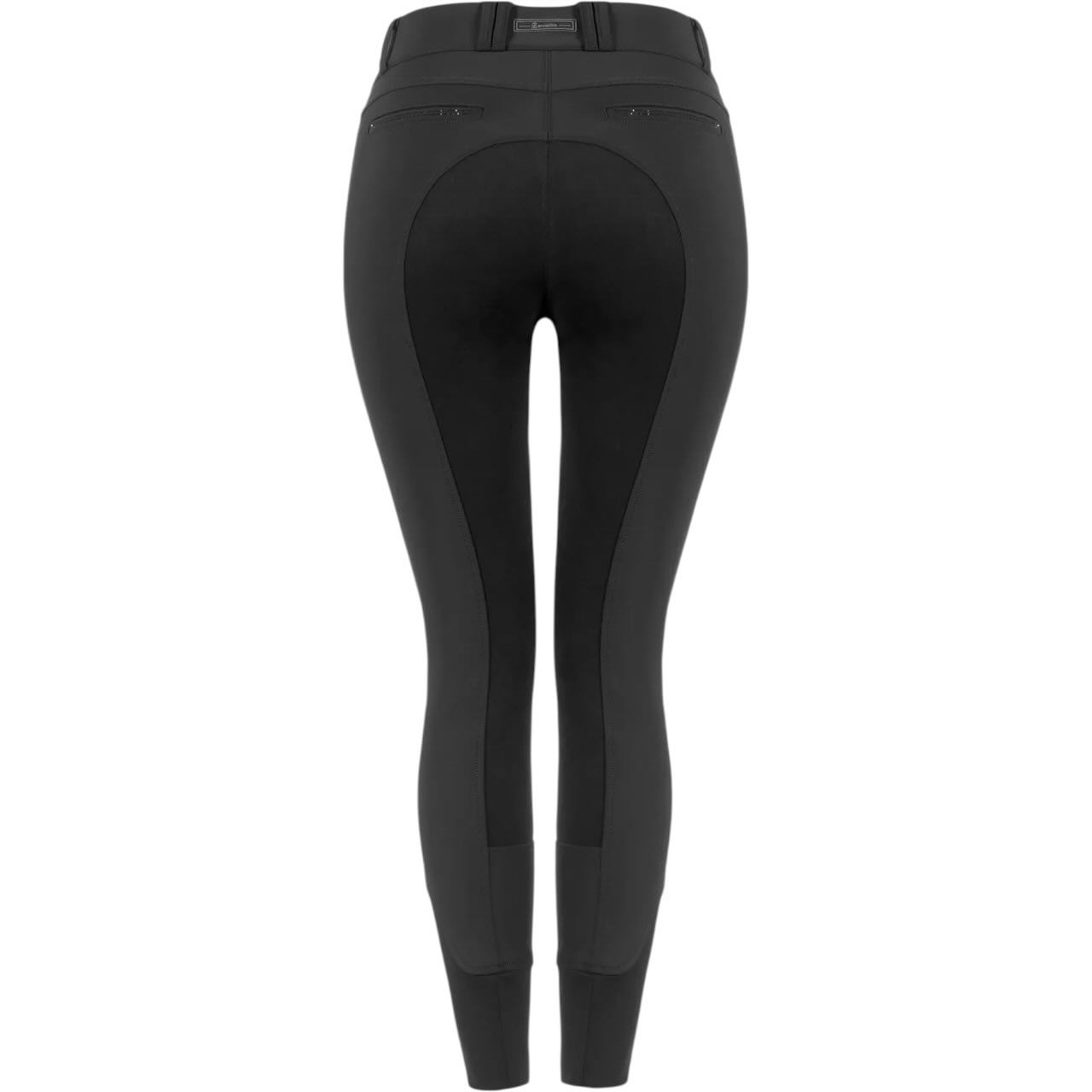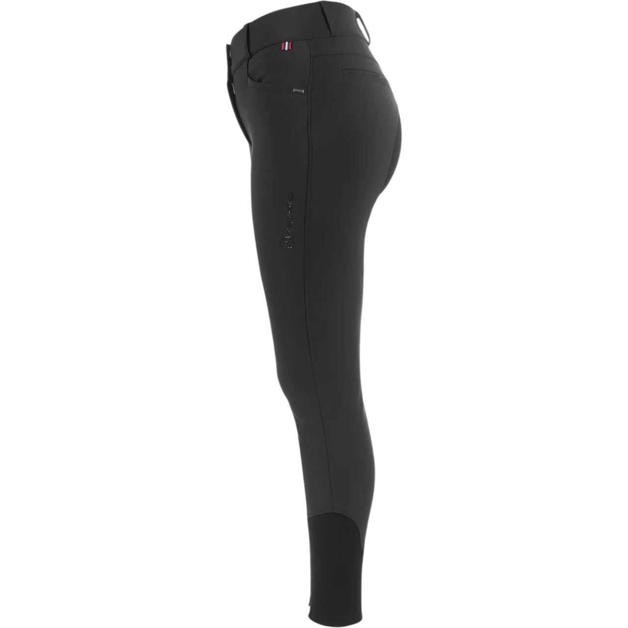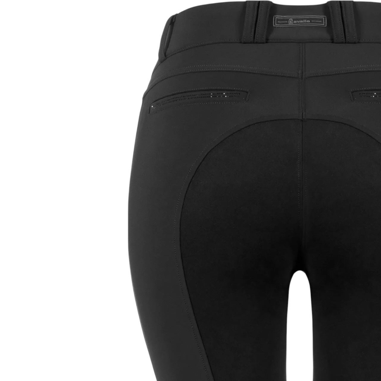 Optisch überzeugt die Reithose mit stilvollen Details in Gunmetal-Optik. Die imitieren Leistentaschen hinten sind mit funkelnden Kristallsteinen verziert und setzen elegante Highlights. Eine Cavallo-Niete sowie die tonige Steigbügel-Stickerei runden das Design harmonisch ab. Das hochwertige Cavallo-Patch am Bund unterstreicht die Markenqualität. Zusätzlich sorgt das Cavallo-Logo aus Kristallsteinen am Oberschenkel für einen exklusiven Look. Schwarze Taschenbeutel mit Kontrastdruck setzen dezente, moderne Akzente.