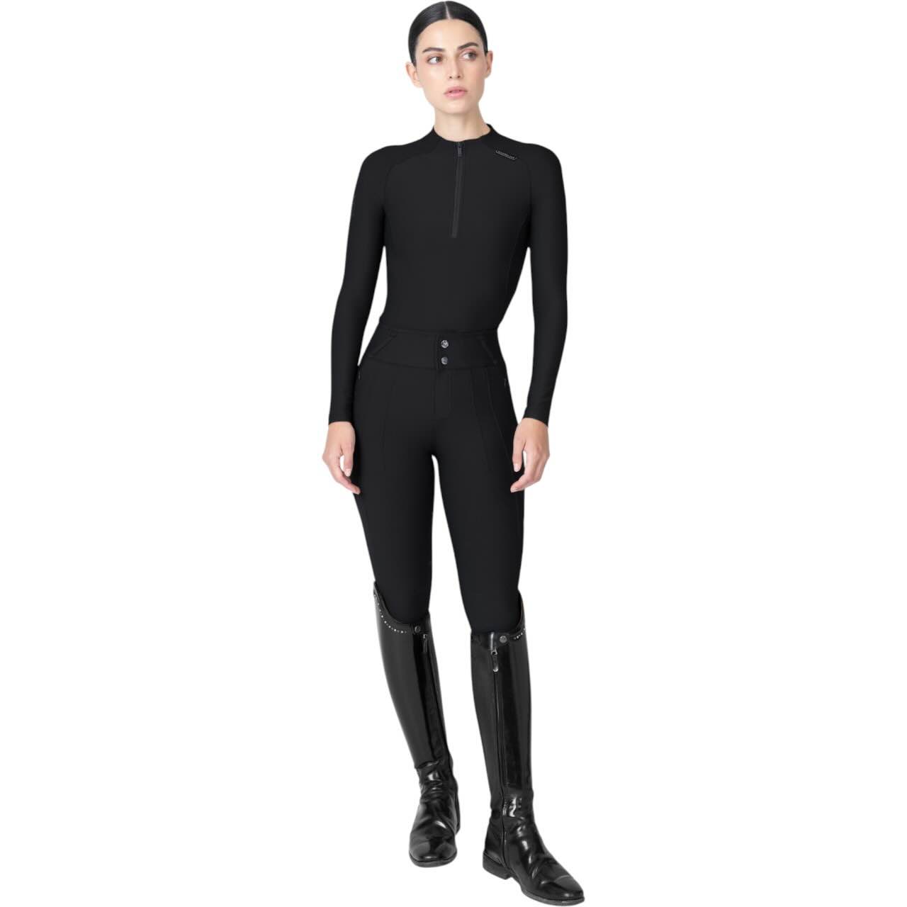Diese Reithose passt sich jeder Bewegung an und unterstützt dich optimal im Sattel. Dank des ergonomischen Schnitts erlebst du volle Flexibilität ohne Kompromisse bei der Stabilität. Die elegant platzierten Abnäher sorgen für eine feminine Silhouette und einen modernen Look. Die hohe Taille mit breitem Bund bietet dir ganztägigen Tragekomfort. Zwei großzügige, unsichtbar eingearbeitete Reißverschlusstaschen sichern dein Smartphone oder kleine Essentials. Durch den Verzicht auf Nähte an den Innenseiten gibt es keine Druckstellen im Kontaktbereich zum Sattel.