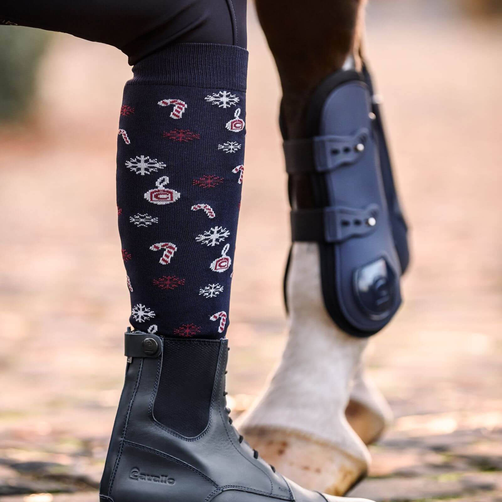 Die Reitsocken Damen Cavalsarita HW 2024 bestechen durch ihr festliches Design mit weihnachtlichen Motiven wie Christbaumkugeln und Schneeflocken. Der dunkelblaue Farbton harmoniert perfekt mit der Winterkollektion und bringt Eleganz in deinen Reitalltag. Dieses exklusive Design ist nicht nur ein Hingucker, sondern auch funktional, da es sich nahtlos in dein Reitoutfit integriert.