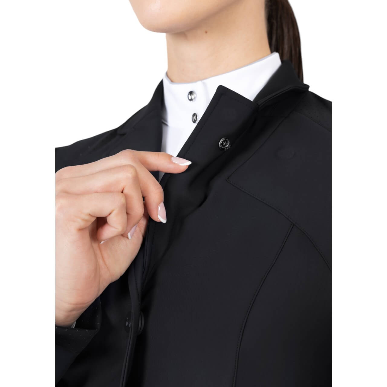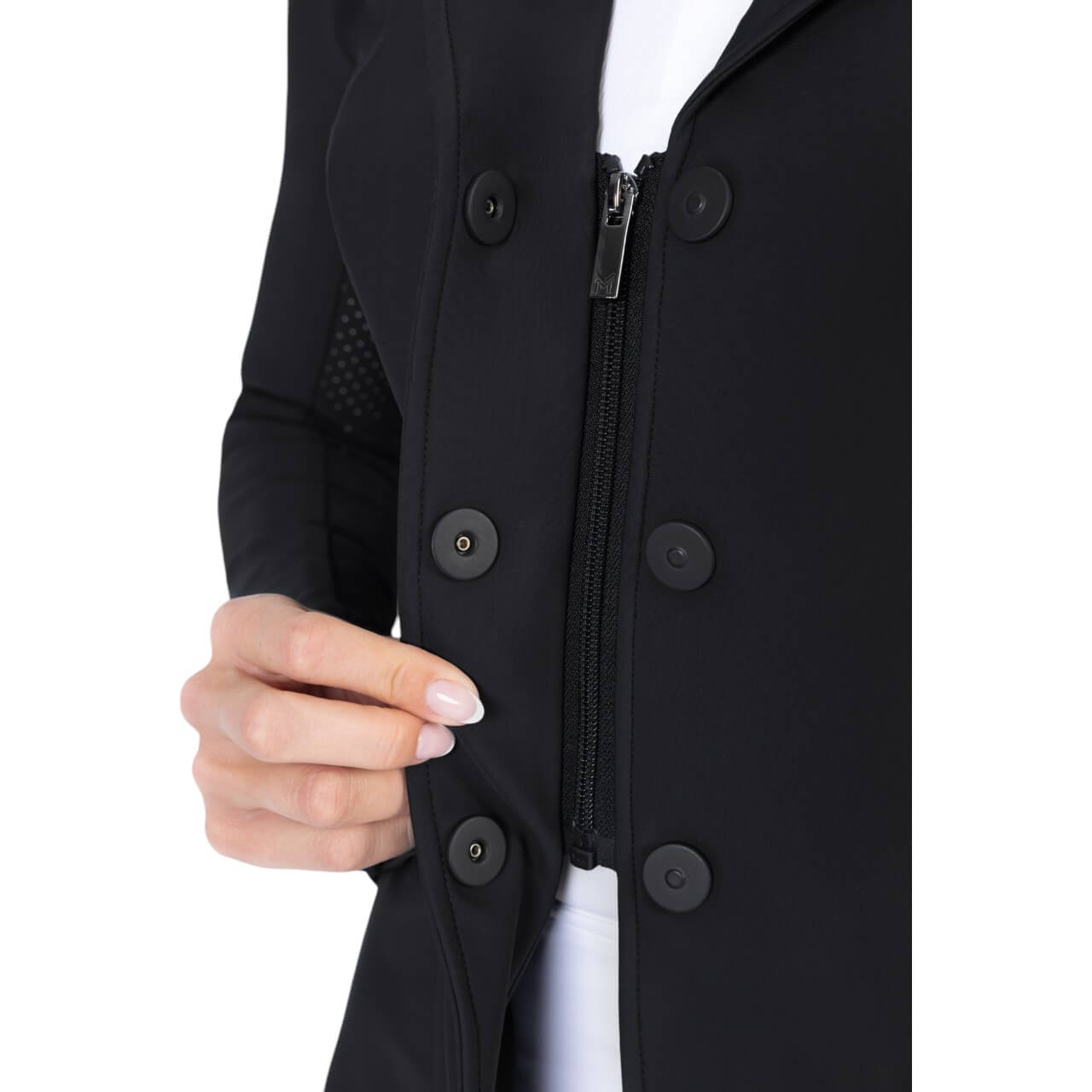 Die durchdachte Schnittführung sorgt für eine schmeichelhafte Silhouette und höchsten Tragekomfort. Ergonomische Konturnähte unterstützen eine optimale Passform, während das elastische Material jede Bewegung mitmacht. Dank des doppelten Verschlusssystems mit verdecktem Reißverschluss und Magnetknöpfen sitzt die Jacke stets perfekt. Perforierte Einsätze verbessern zudem die Belüftung.