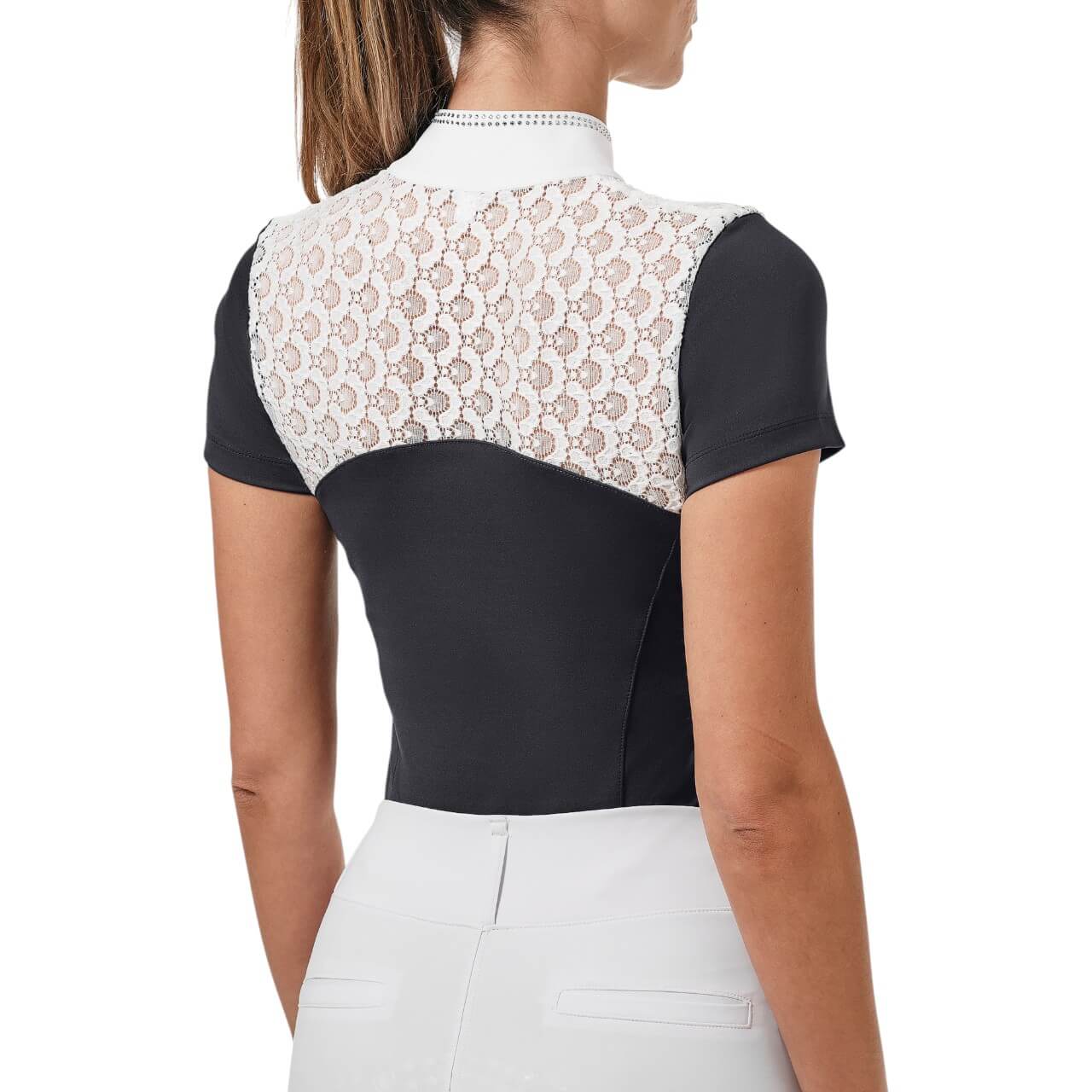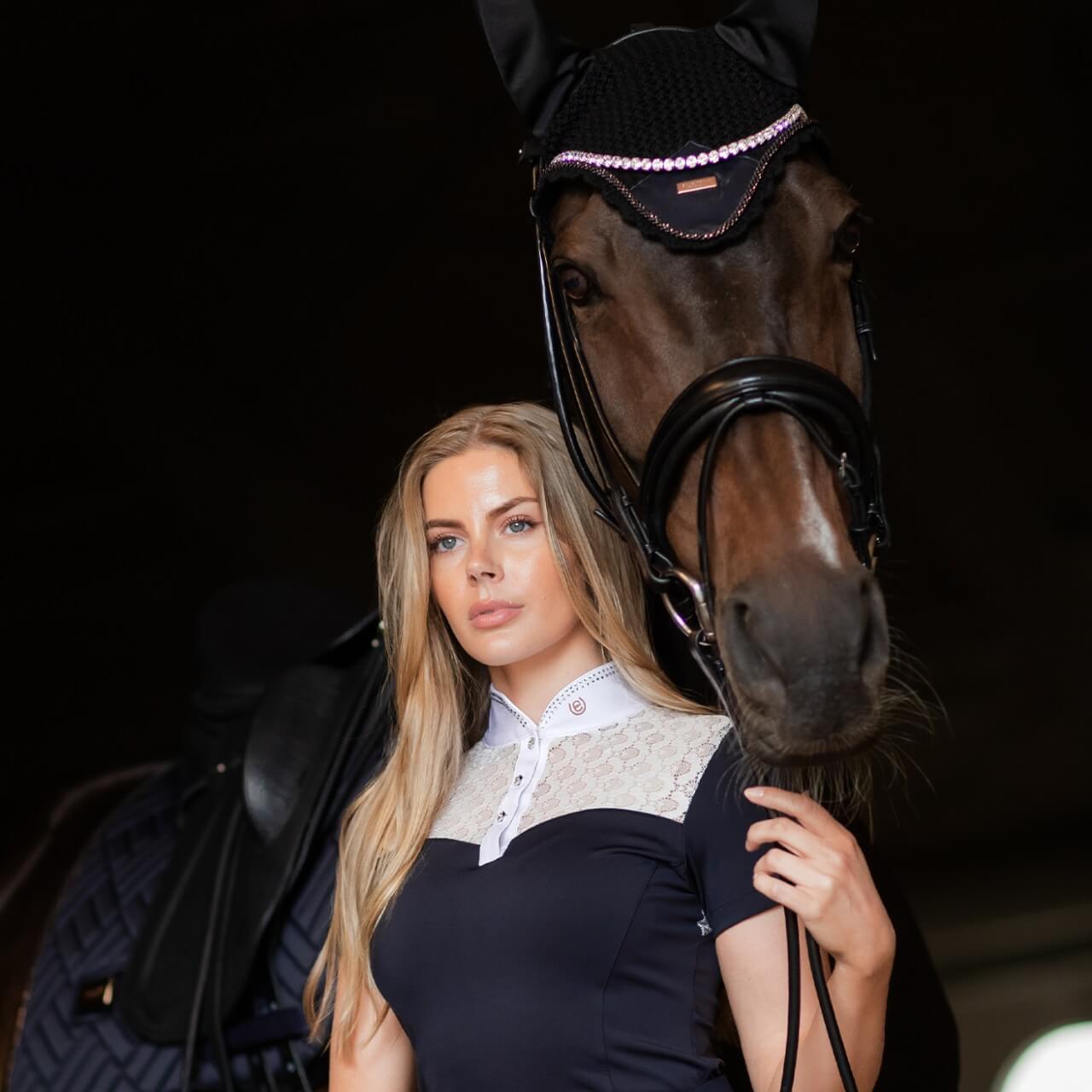 Das Turniershirt Damen Crystal Champion Competition Top White Dark Ocean besticht durch seine einzigartige Farbgebung in White Dark Ocean, ergänzt durch feine Spitzendetails. Die geschickt platzierten Kristalle am Kragen verleihen deinem Auftritt eine luxuriöse Note. Diese optischen Highlights sind nicht nur ein Hingucker, sondern bieten gleichzeitig praktische Vorteile, indem sie die Blicke auf dich lenken, während du im Sattel brillierst.